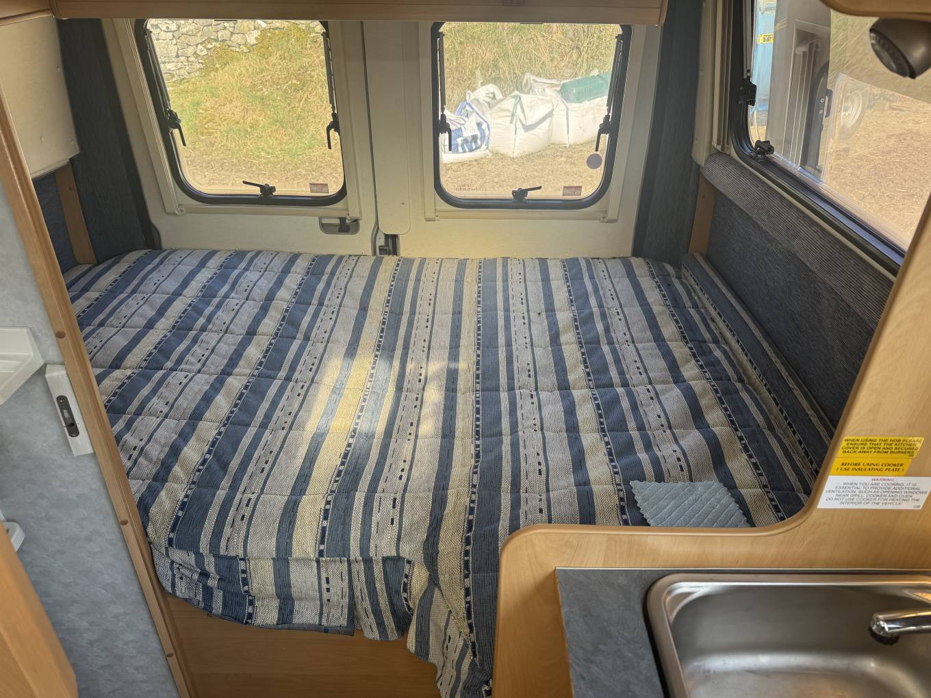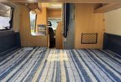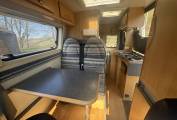 Starting with the rear of the motorhome, you have a large fixed elevated double bed surrounded by multiple spot lights with plenty of storage space in the overhead cupboard. Underneath the bed is the huge garage which has plenty of room for things such as the awning sides, luggage etc.