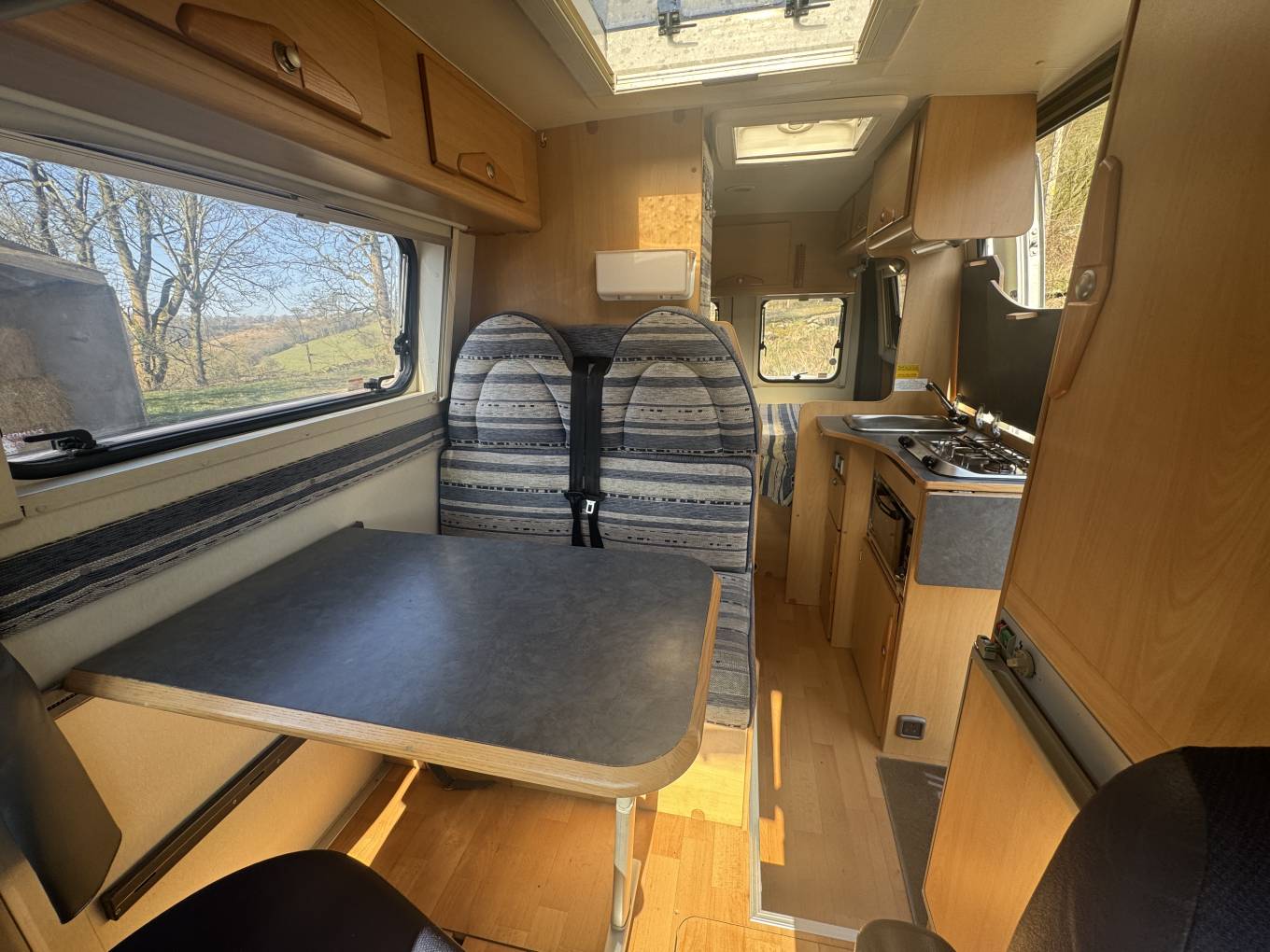 As we head towards the front of the motorhome, we come to the large lounge/dining area where there are the rear two travelling seats and driver seats that swivels with a large dining table in between that offers that family dining experience.