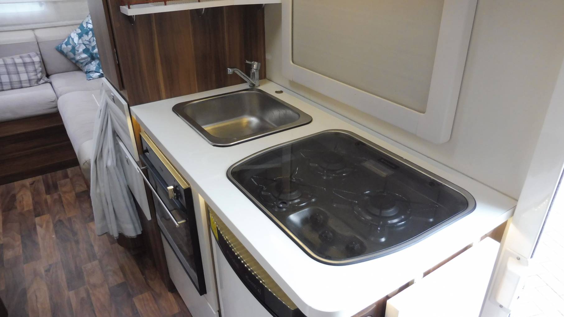 Moving rearward there is a well-equipped kitchen with 3-burner hob, combination oven, sink and 3-way fridge, perfect for preparing lunchtime snacks or the evening meal. Opposite which is a well proportioned washroom with vanity sink unit, cassette toilet and fully enclosed shower.