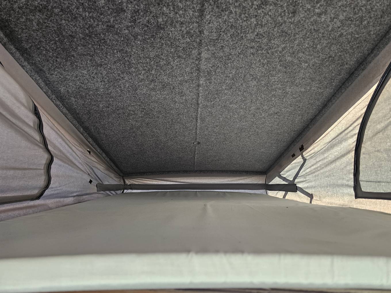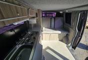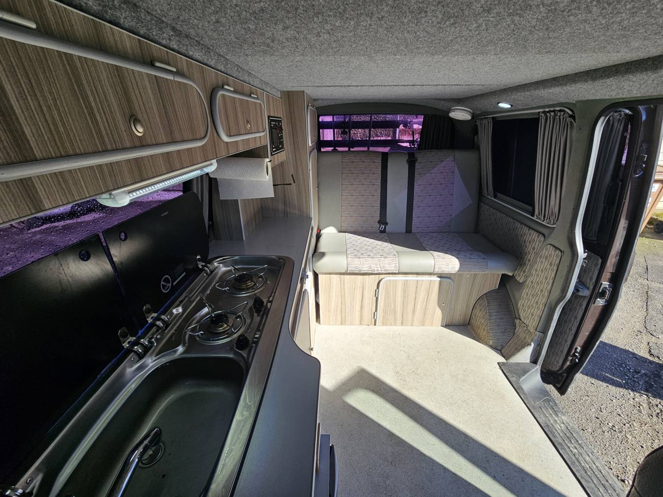 The kitchen area is well lit with LED lights, also includes two gas burners, gas bottle, a sink with a mixer tap, and a fridge with a freezer compartment. Also comes with a blow up awning.