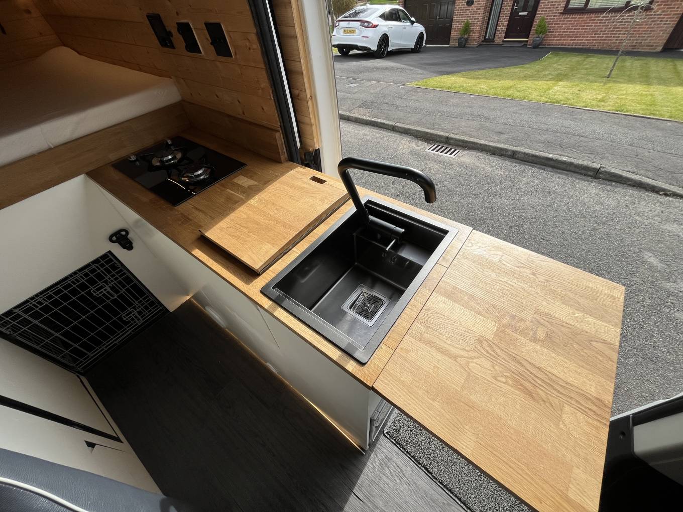 comfortably. A kitchen area includes a dual-burner gas hob, sink with hot water,