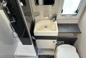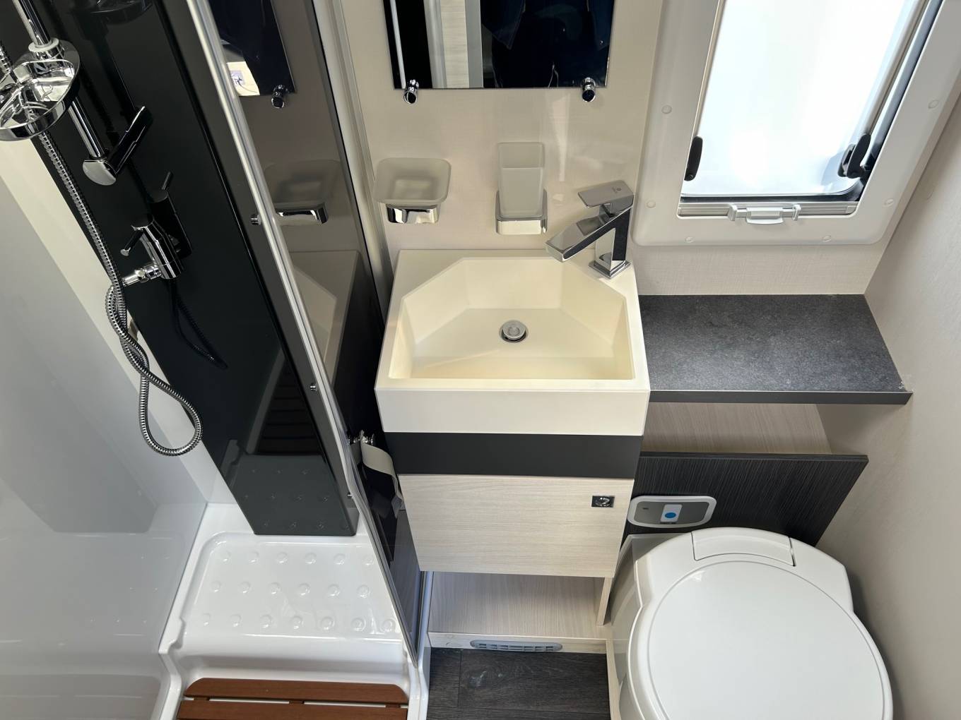 In the rear there is a complete toilet compartment. This includes a separate fully equipped shower, wash hand basin, cassette toilet and a vanity mirror with storage.