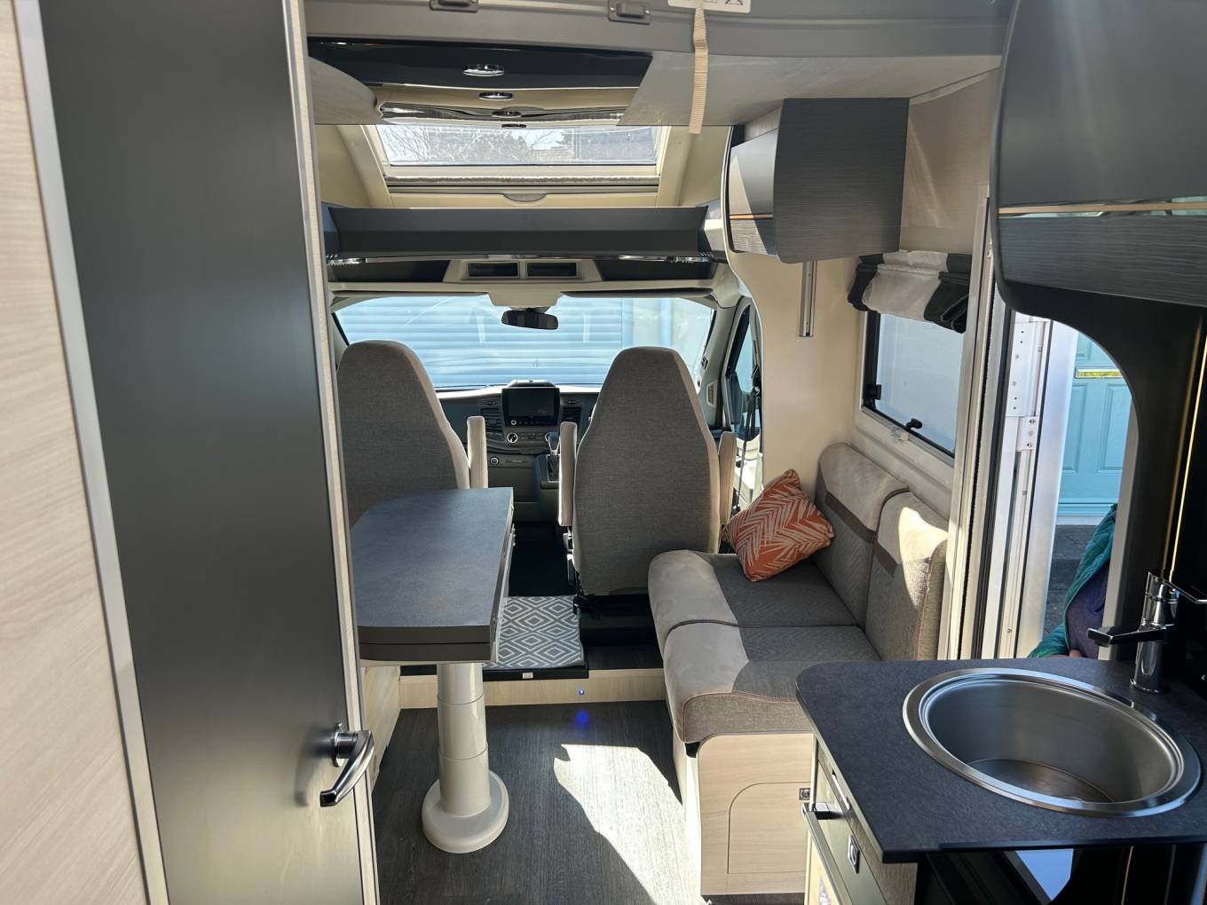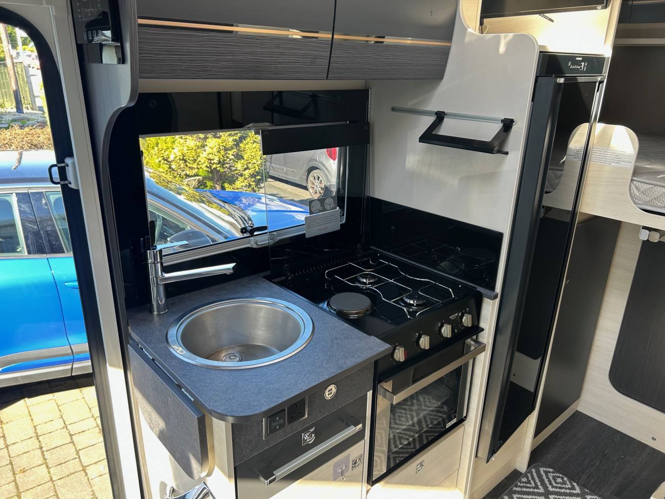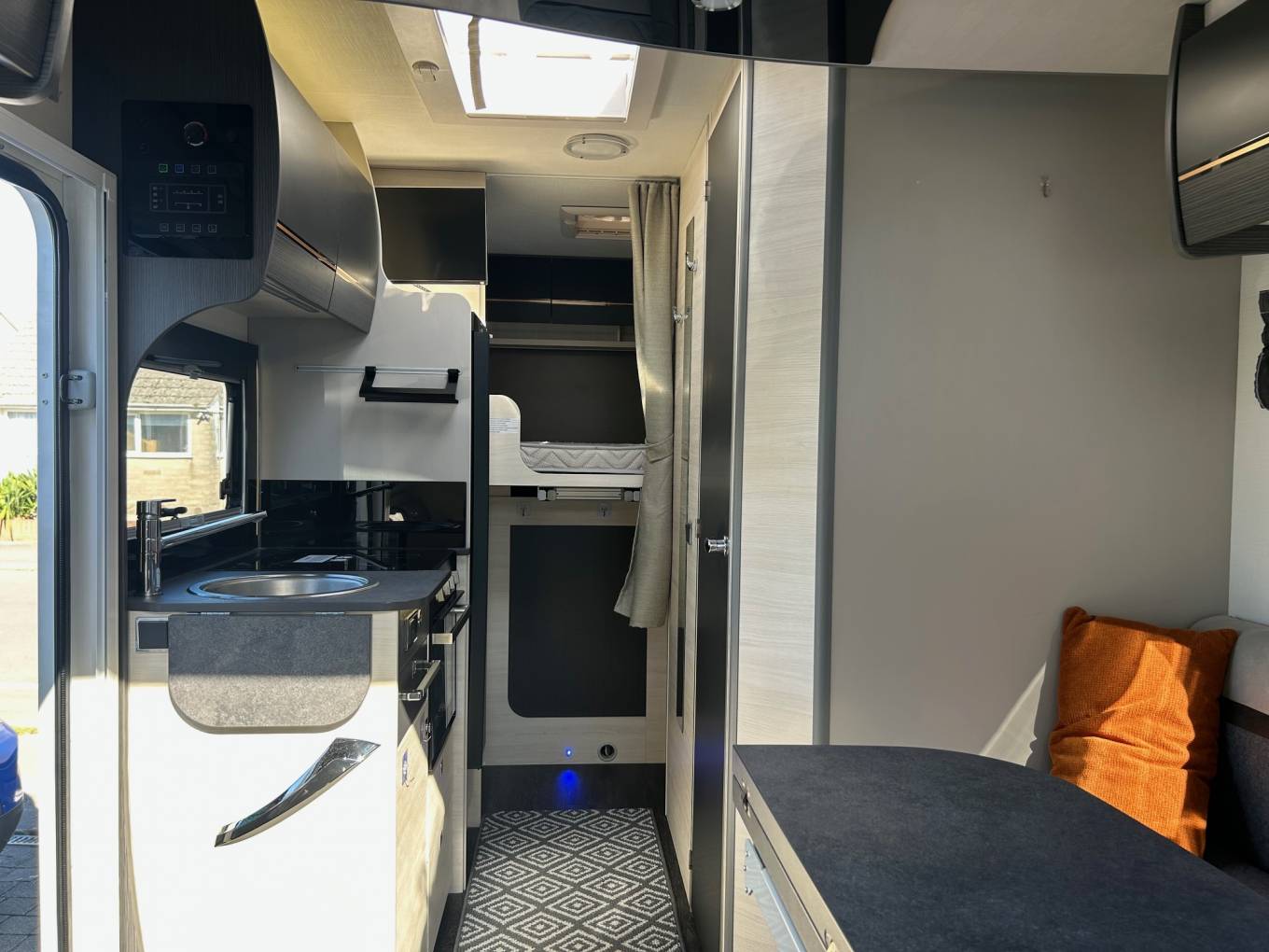 Excellent storage throughout the living area, with extra storage in the rear garage. This massive garage has power and USB and a light. It’s big enough to take three bikes. Webasco Diesel heating and Truma dual fuel hot water provided. A cleverly concealed 21.5 inch TV unit turns around so you can watch in the leisure area or in bed.