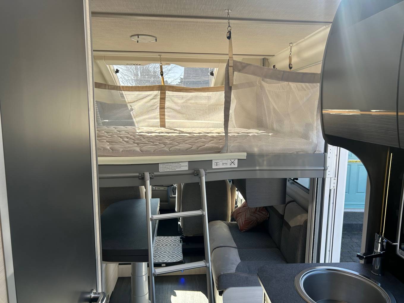 There is an king size bed above the lounge area which comes down electrically. It has ladder access. The seats in the leisure area make up into a further singe bed.