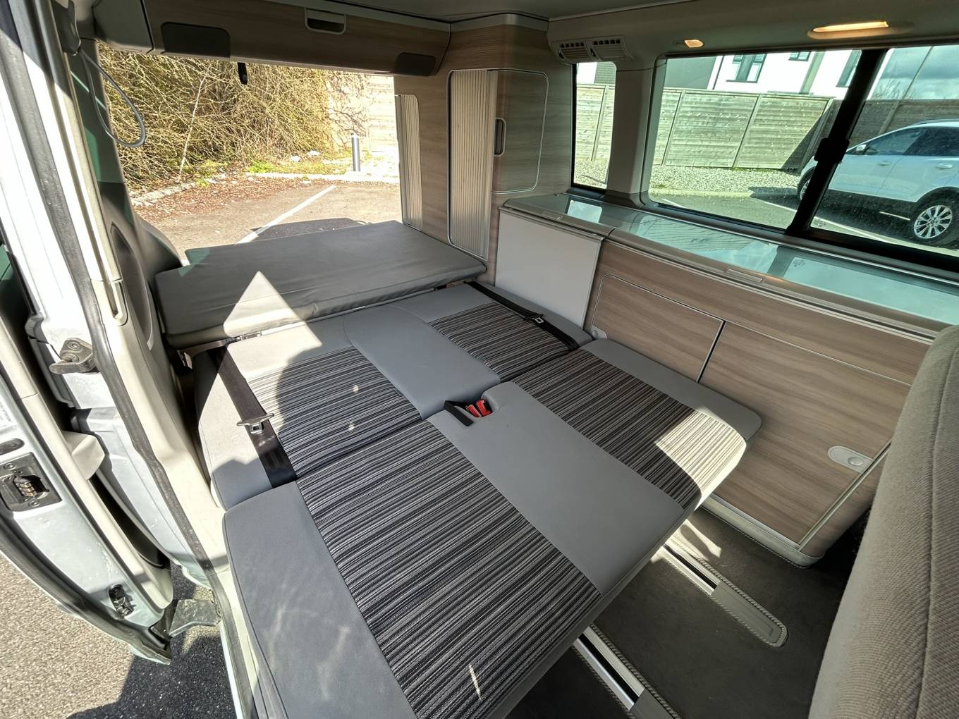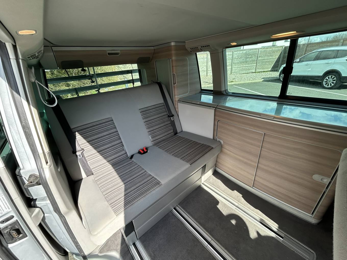 Inside, the California showcases Volkswagen's amazing build quality with thoughtful touches throughout. The two swivel seats create a comfortable lounge area, while the rock 'n' roll bed system provides effortless conversion to sleeping accommodation. Climate control is assured year-round with both habitation heating and air conditioning, making this equally suitable for summer festivals or winter retreats.