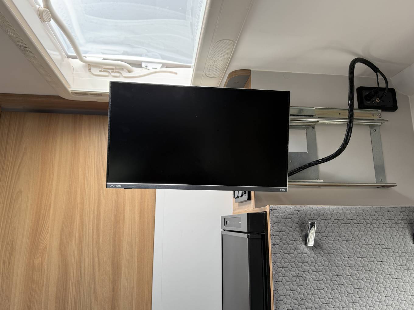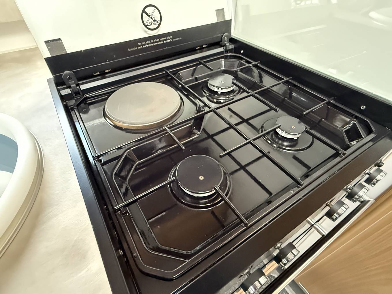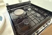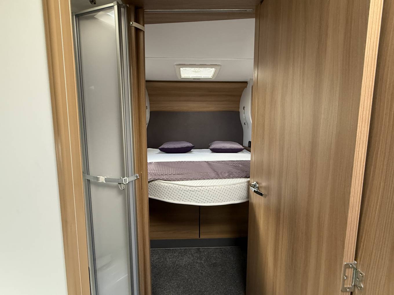 This area easily converts to a double bed on an evening if required. Kitchen facilities include a 3 ring gas hob with 1 electric ring , oven/grill and tall fridge with freezer box. The split facilities in the central washroom offer separate shower cubicle and vanity washroom which can be used as en-suite or a privacy screen can be used to divide from the main bedroom area.