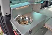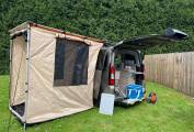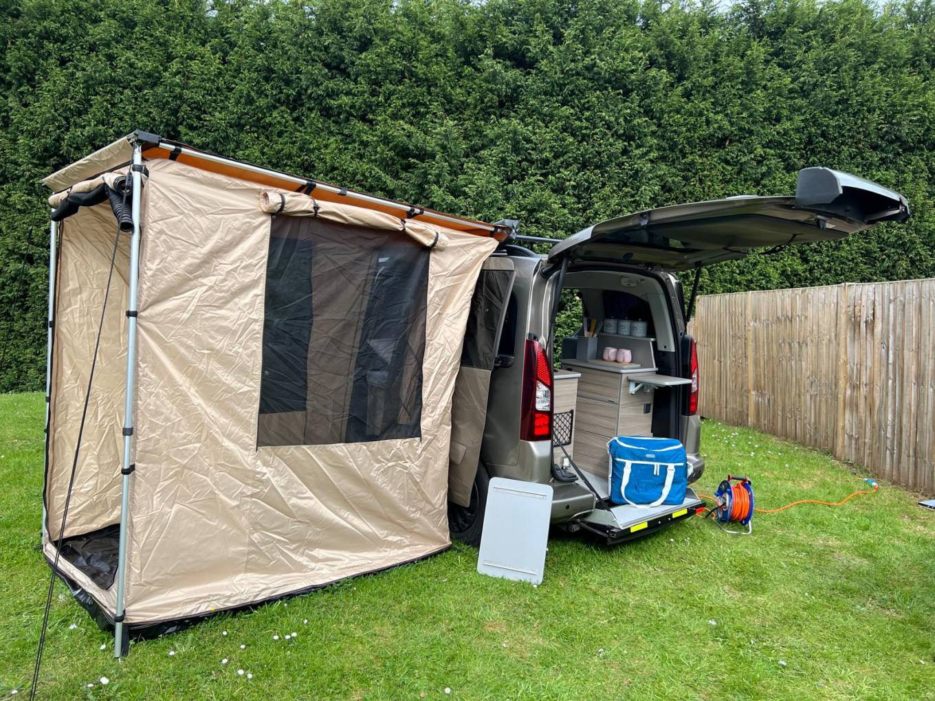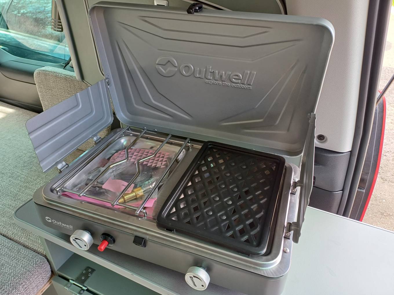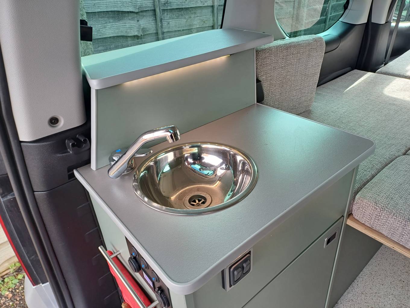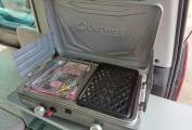 The portable camping stove allows for preparation of simple meals or brewing up while you’re on the road, with a sink with running cold water built into the work surface. An additional tailgate awning is included in the sale.