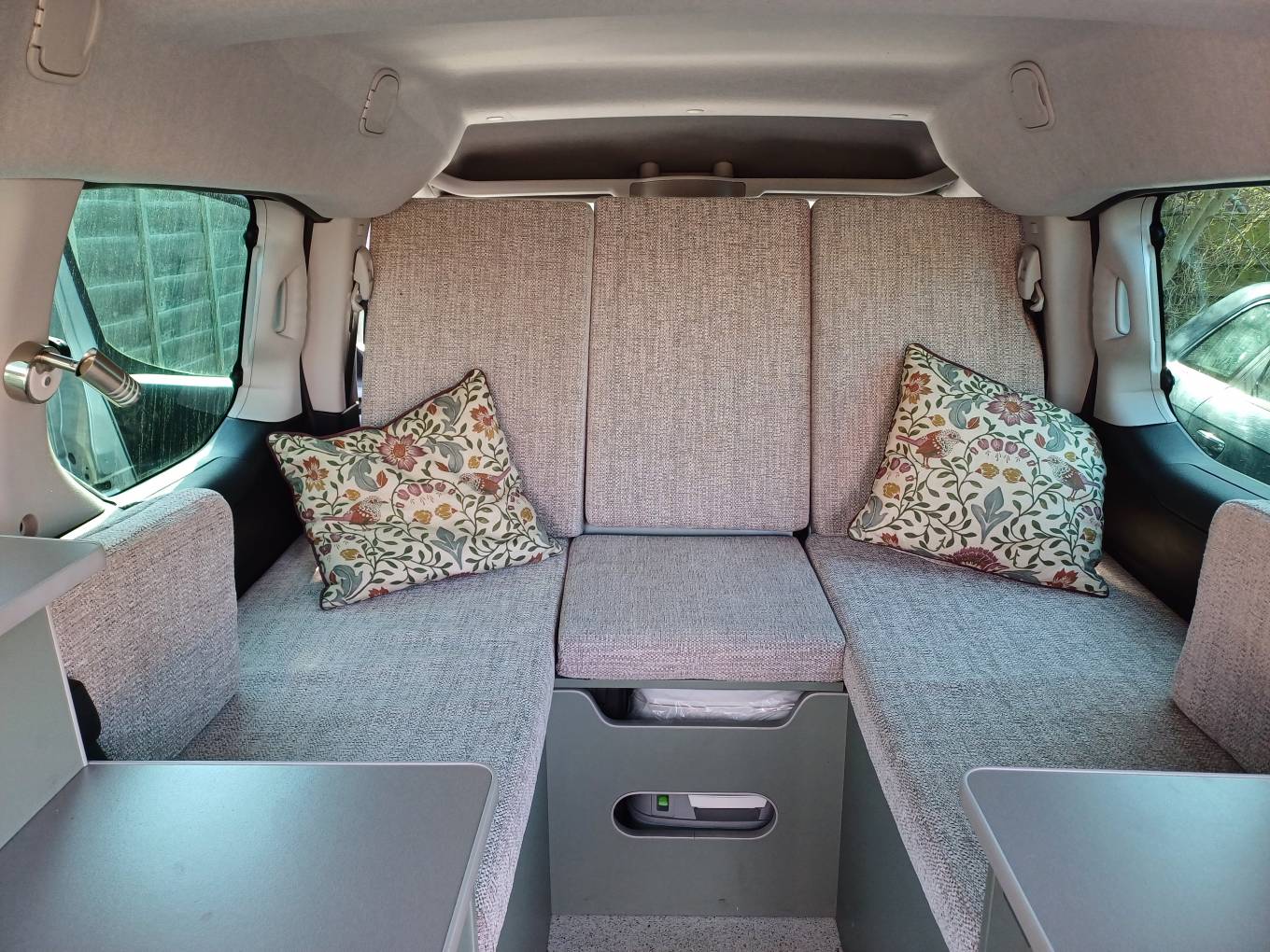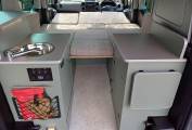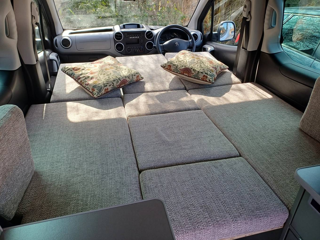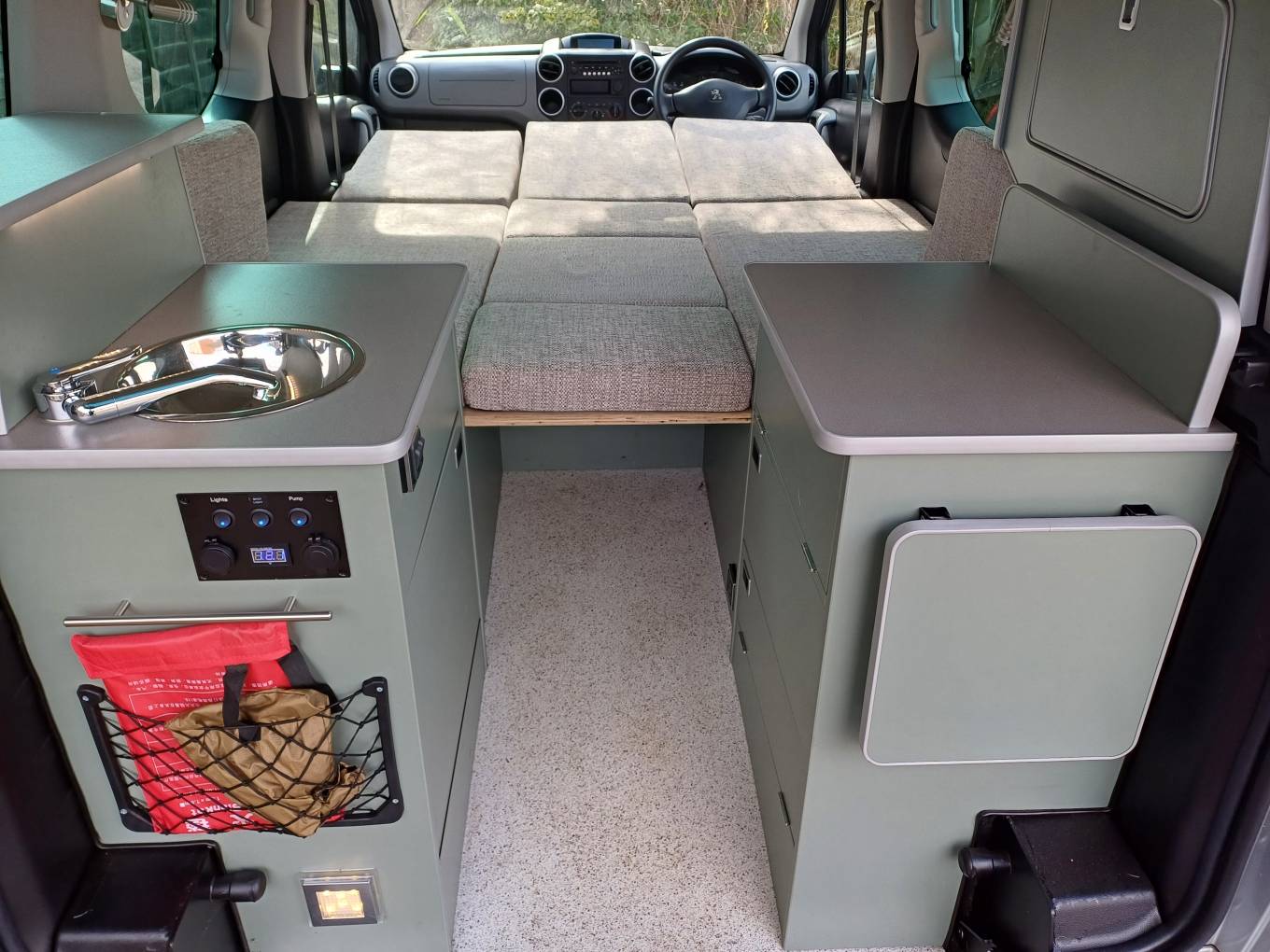 A delightful Microcamper for 2 based on the Peugeot Horizon with low mileage and beautifully finished in Sage Green with Alpine upholstery.