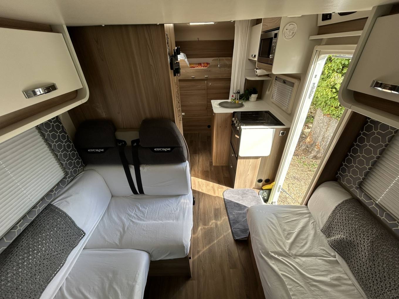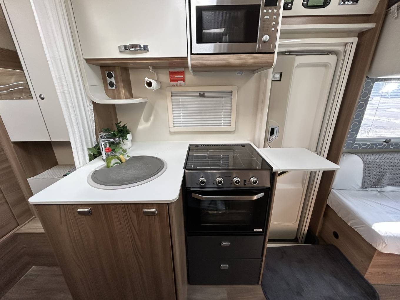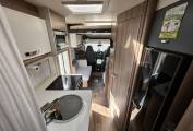 The intelligently designed interior offers flexible sleeping for six via the pull-down over-cab double bed, rear bunk beds and convertible lounge bed. Large windows with fly screens and blackout blinds create a light, airy atmosphere while maintaining privacy. The well-equipped kitchen features a three-burner hob, oven/grill and generous fridge-freezer, while the practical washroom includes a shower, toilet and ample storage.