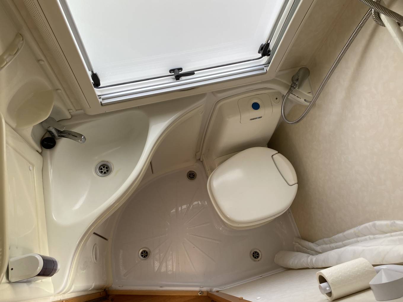 medicine cabinet, opening opaque side window, skylight and an integral shower.