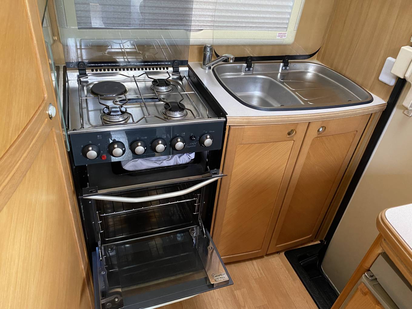 glass worktops that fold down over the sink unit, mixer tap, 3 way combination Dometic