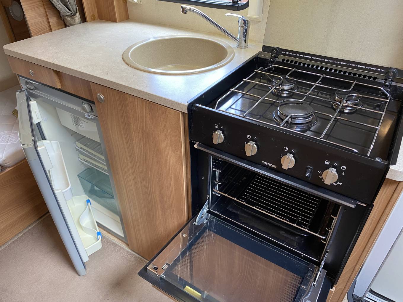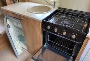 powered fridge, a Dometic 3 gas burner hob, Thetford combination oven and grill,