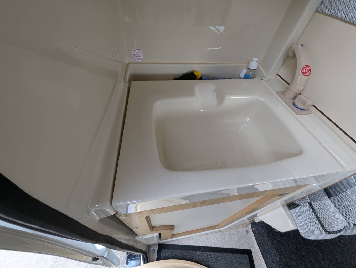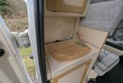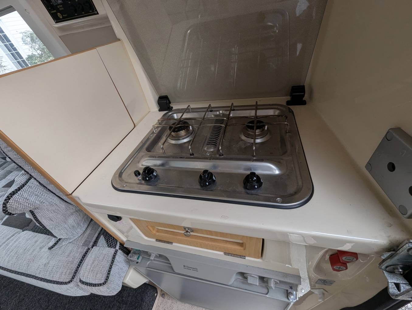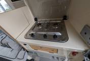 There is room for a porta potti in the cupboard opposite the kitchen unit. The sink is above this cupboard and has a pumped cold fill from the onboard water tank. A two burner hob and grill under this and a large storage cupboard complete this section, accessed via the central rear facing habitation door.