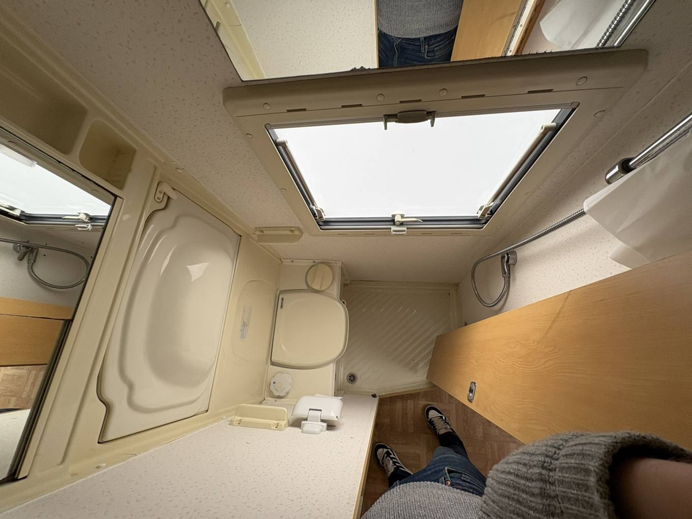 ✅ Onboard Bathroom – Stay self-sufficient with a clean, practical washroom including a shower, toilet, and drop down basin.
