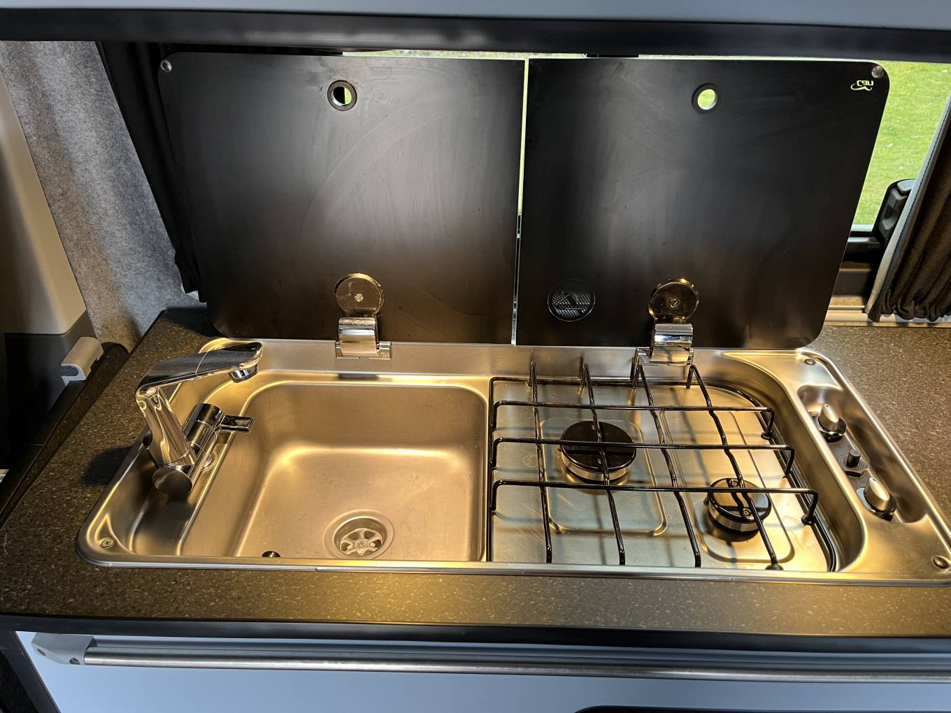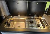 features a fully equipped kitchen with a two burner gas hob, sink and fridge