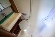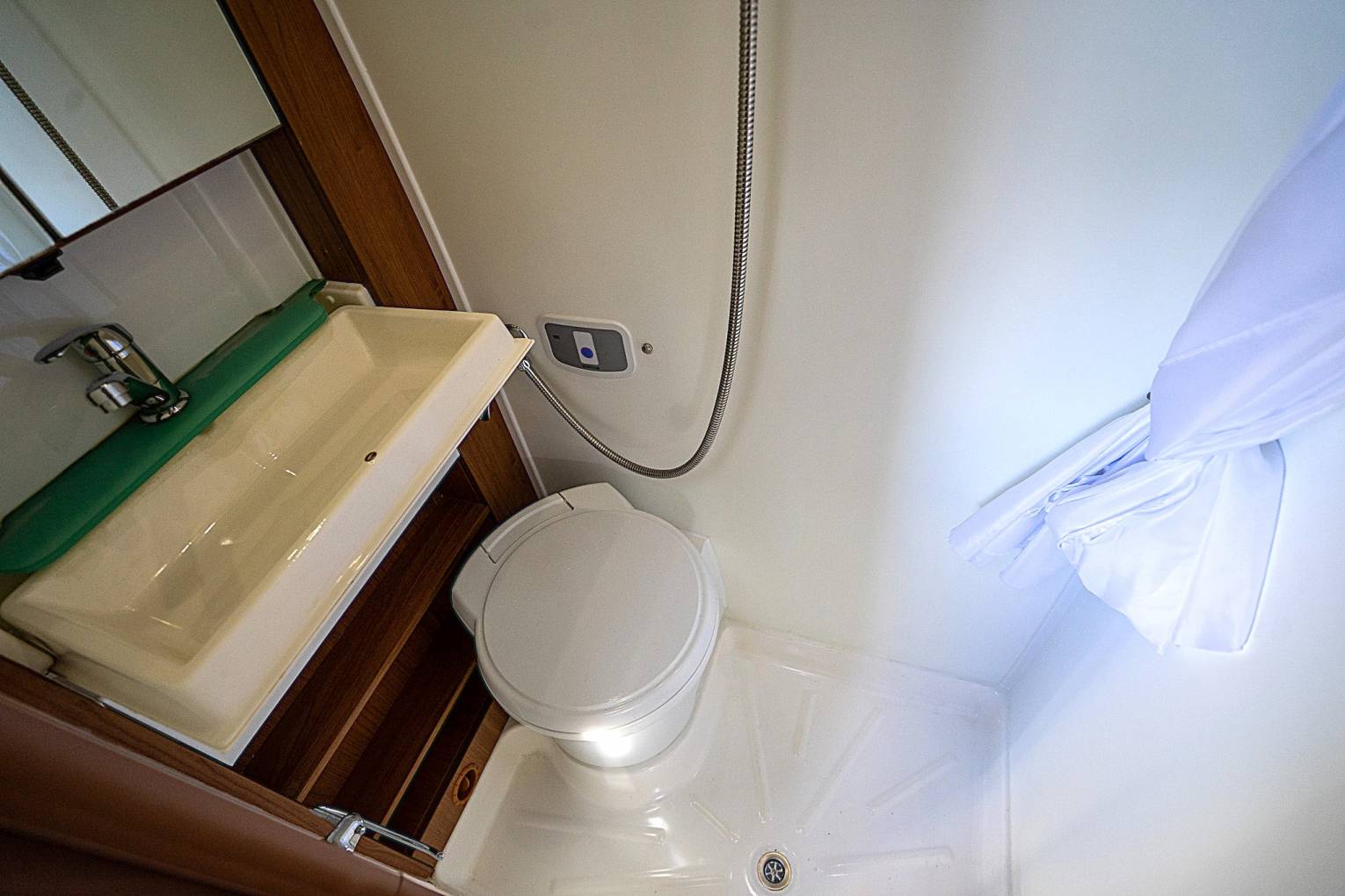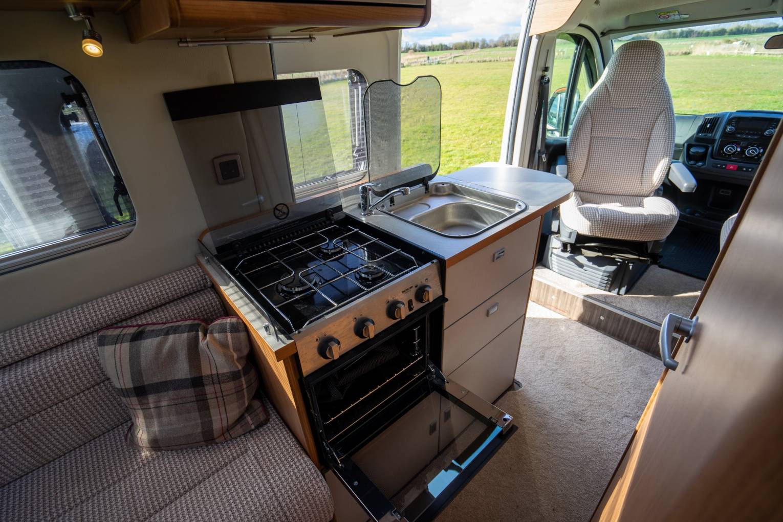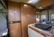 In the centre of the habitation area is the kitchen which has a sink, 3 gas hobs, grill, oven, microwave and fridge. Opposite this is the washroom which contains a toilet, shower and a handy fold down sink which is great for saving space. Towards the front there is a small wardrobe and plenty of other cupboards dotted around for all your belongings.
