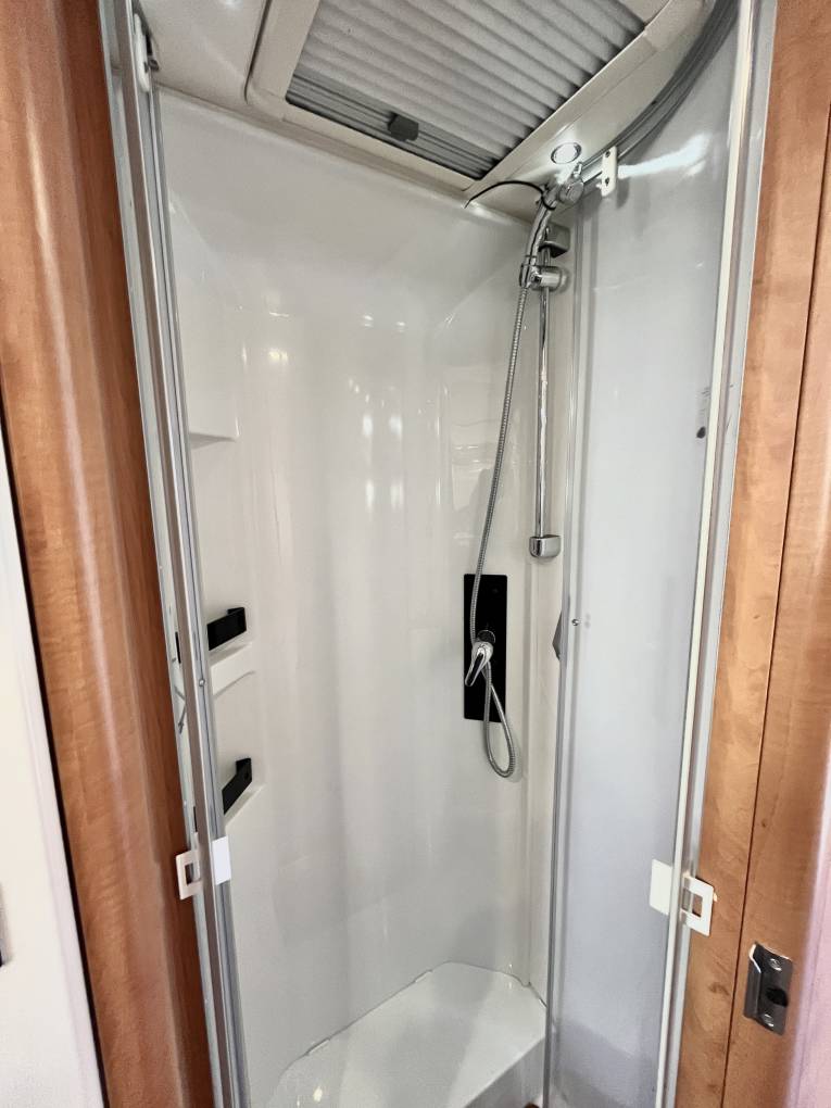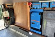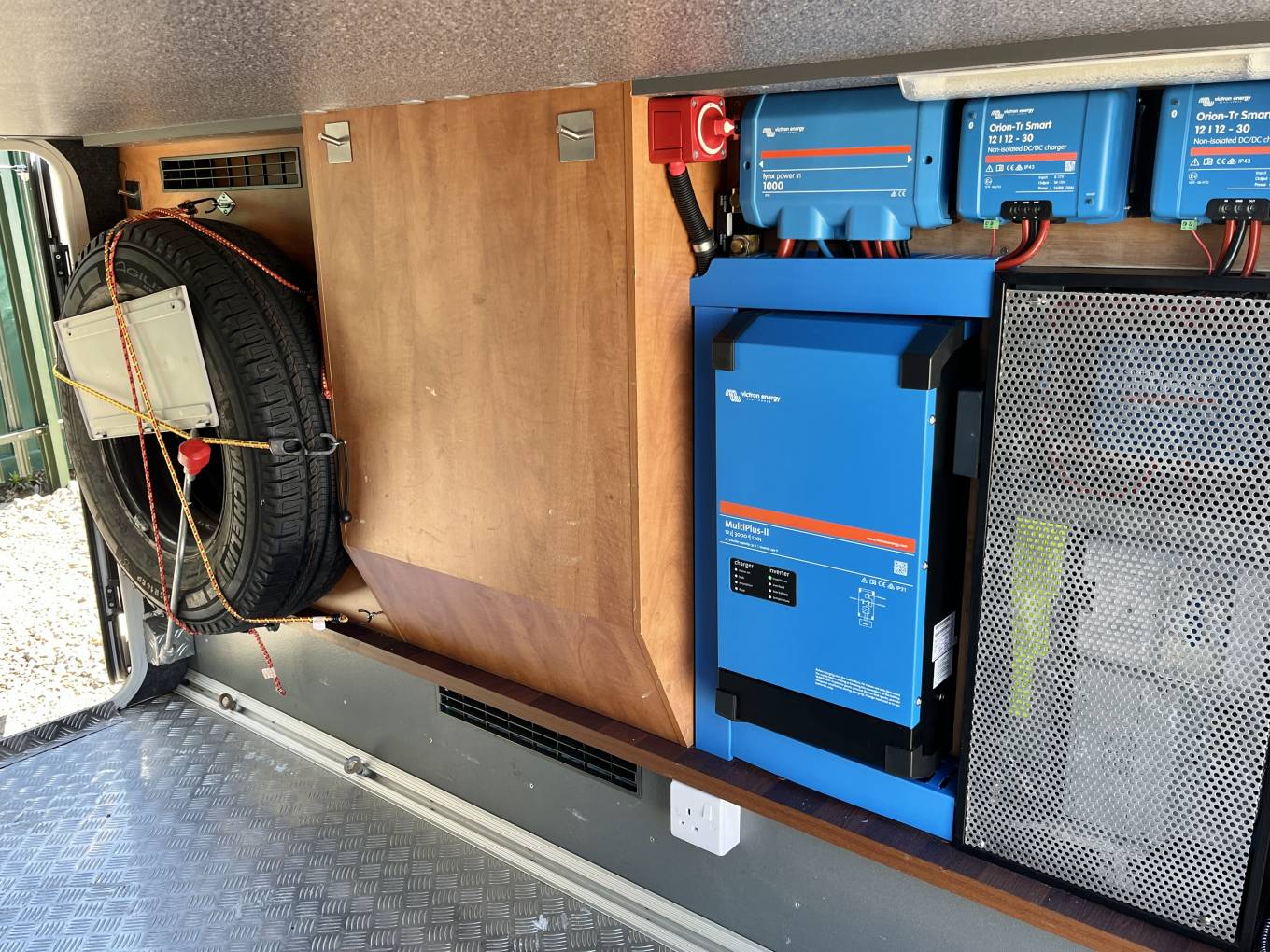 The large twin door rear garage houses the vans off grid Victron system with Multi Plus 2 inverter, battery monitor and smart solar mppt unit, spare tyre and outside shower point, on the outside of the van we have again good sized storage lockers, a twin bottle Gaslow system locker, Tow Bar, outside BBQ point along with a Thule Omnistor awning and three 175W solar panels.