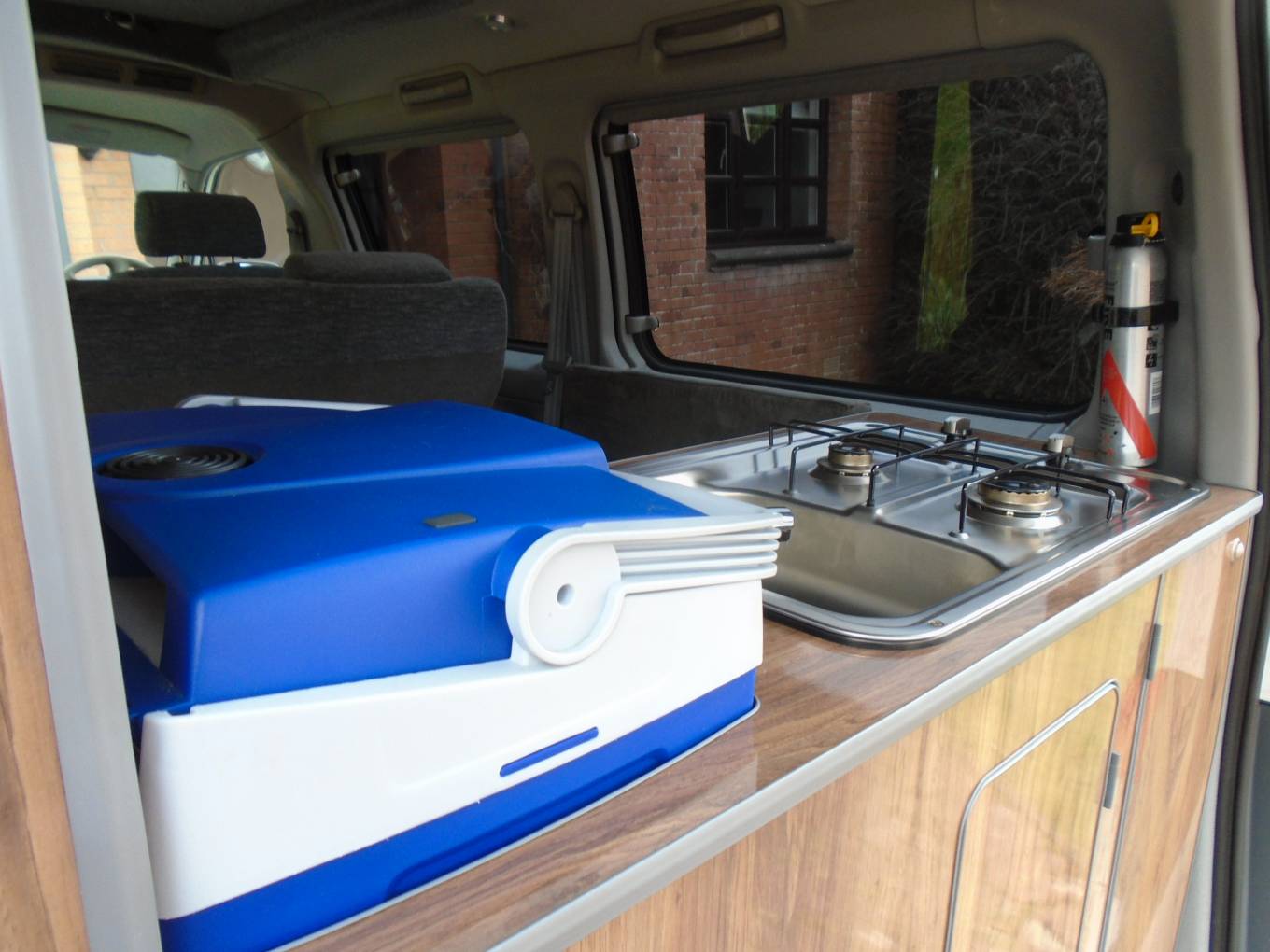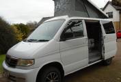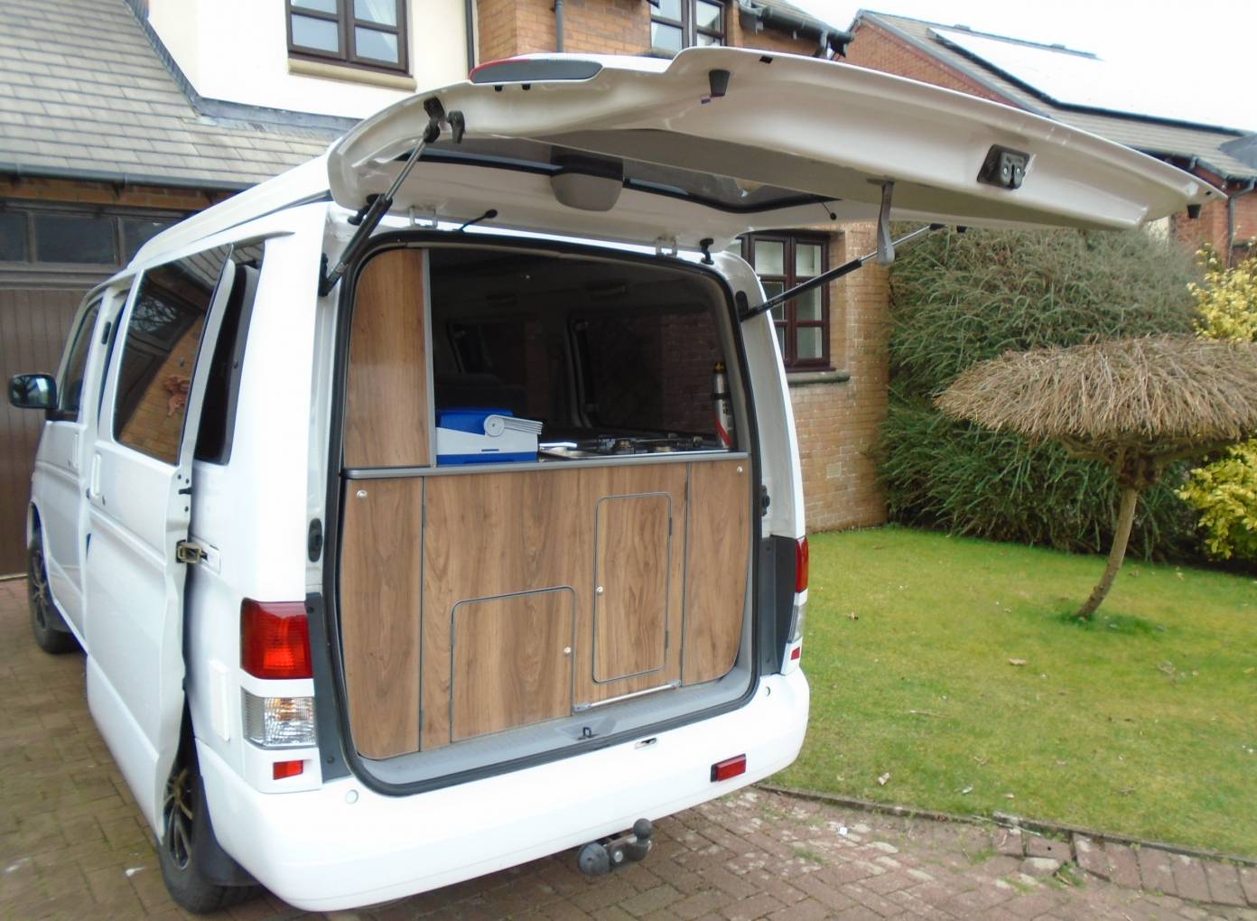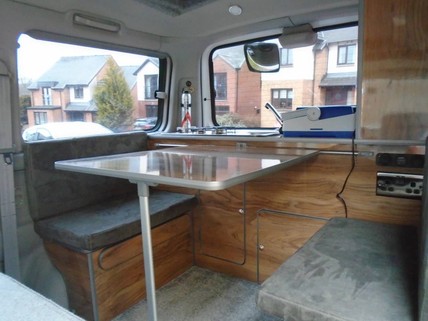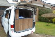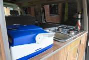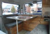 This vehicle comes with, five seat belts, sleeps four - two adults and two children, maximum three adults comfortably. There is a rear kitchen in the vehicle which can be accessed comfortably from inside and out with a table that can be clipped onto the rear of the vehicle to assist with outside cooking and dining. With a two ring gas hob which operates from a small gas bottle and an electric cool box, cooking is made easy and accessible from inside and outside the vehicle. There is a good amount of cupboard space with additional storage under the dining area seats. USB points and electric plug points throughout the vehicle and there is Cab aircon and a diesel heating system in the van. Van fully operational on hook up.