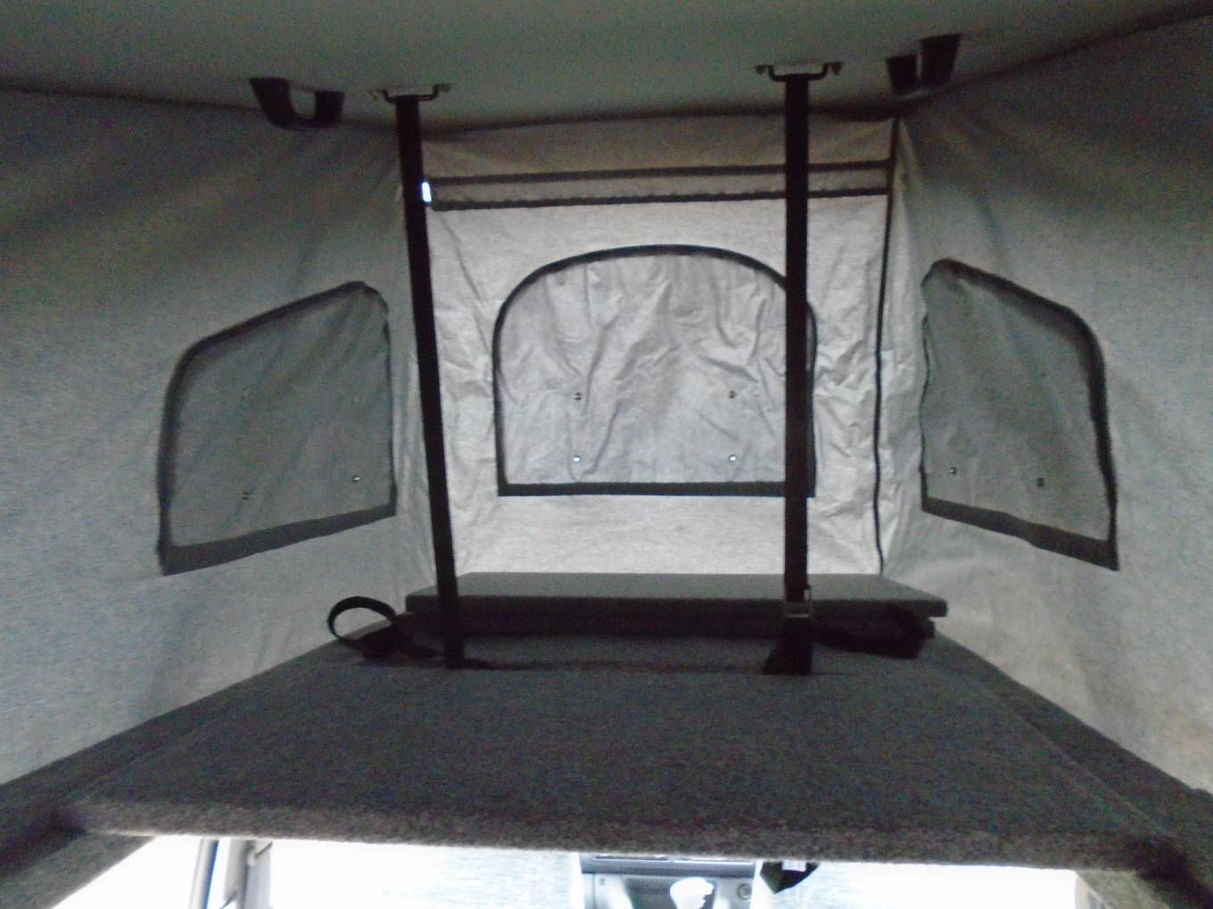 This vehicle is very well presented, clean and tidy with pull down blinds throughout to maximise privacy and gives a cosy yet highly spacious and compact feel. The pop top roof is clean and in very good condition and adds additional height and space inside the vehicle while offering comfortable sleeping accommodation for two children or one adult. Additionally, can be used as storage.