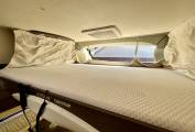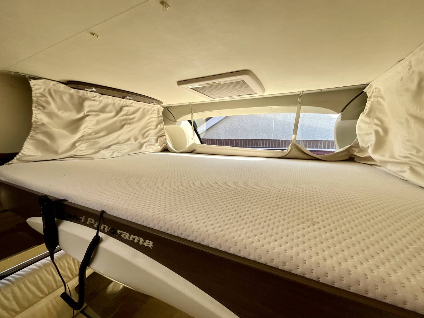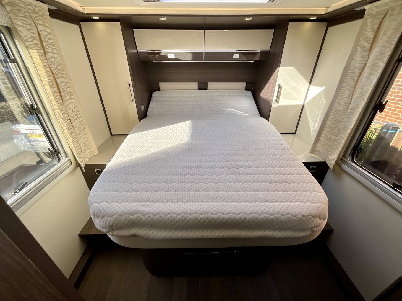 To the rear, the large island bed which can be adjusted electronically allows for a comfy night's sleep. Underneath, there is plenty of storage, and a wardrobe either side for clothes.