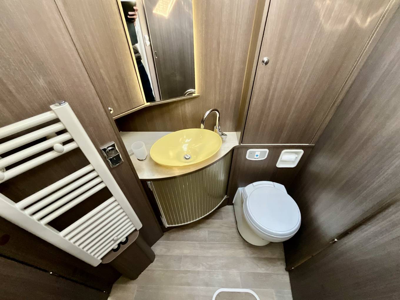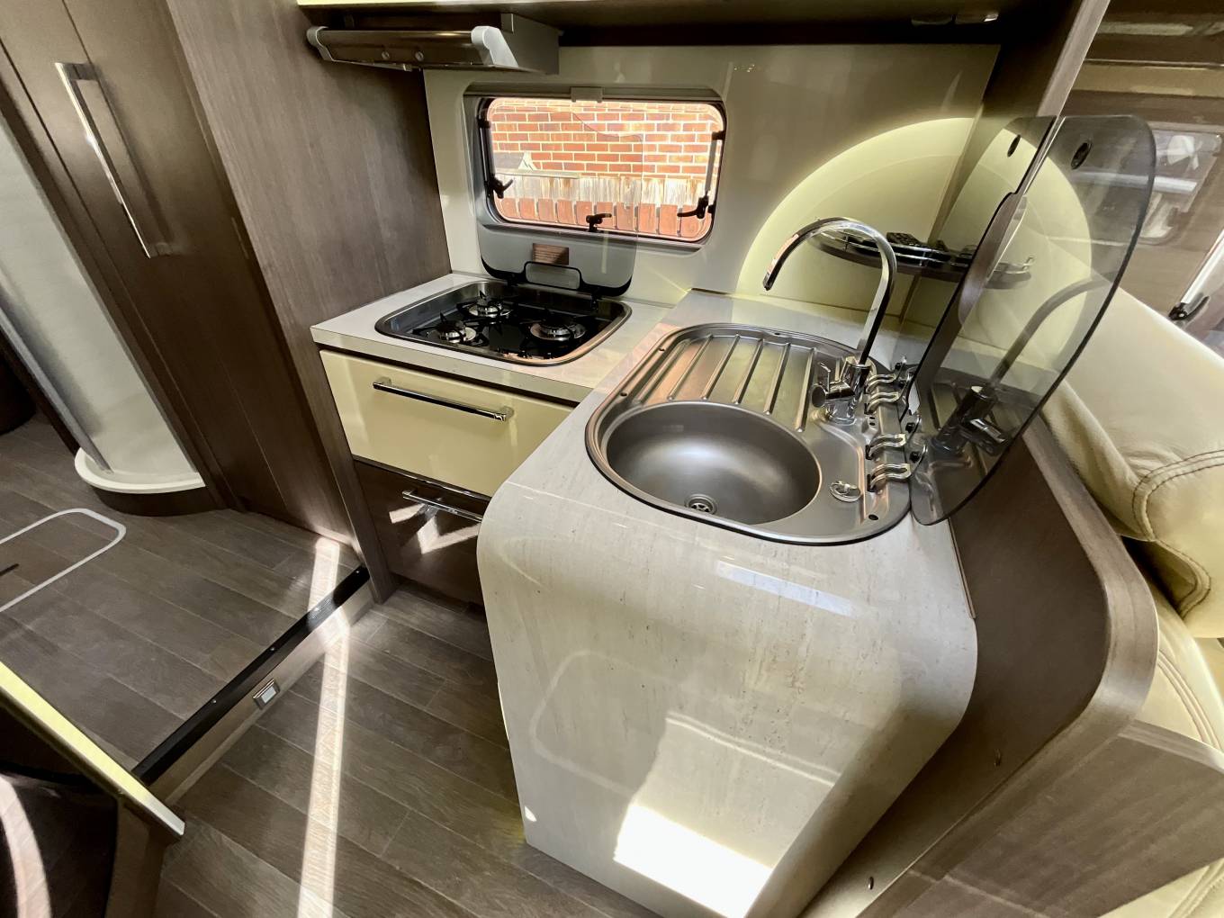 The washroom can be completely partitioned on both sides, allowing privacy from both the bedroom and front lounge. The spacious separate shower is comfortably sized, and the washroom comes equipped with vanity unit, Thetford toilet with cassette and washbasin. A large wardrobe also features in between the washroom and kitchen area.