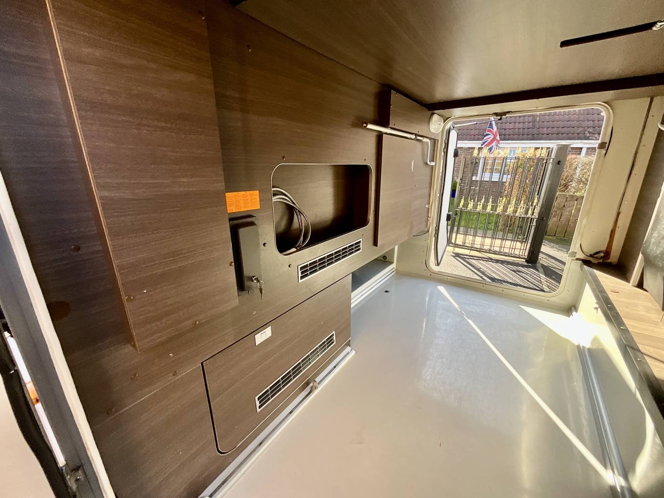 The middle kitchen is fully equipped with everything the travelling chef needs, including gas hobs, Dometic three way fridge with freezer, microwave with grill function, sink and plenty of storage throughout.