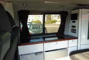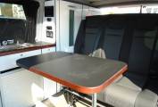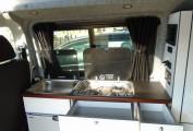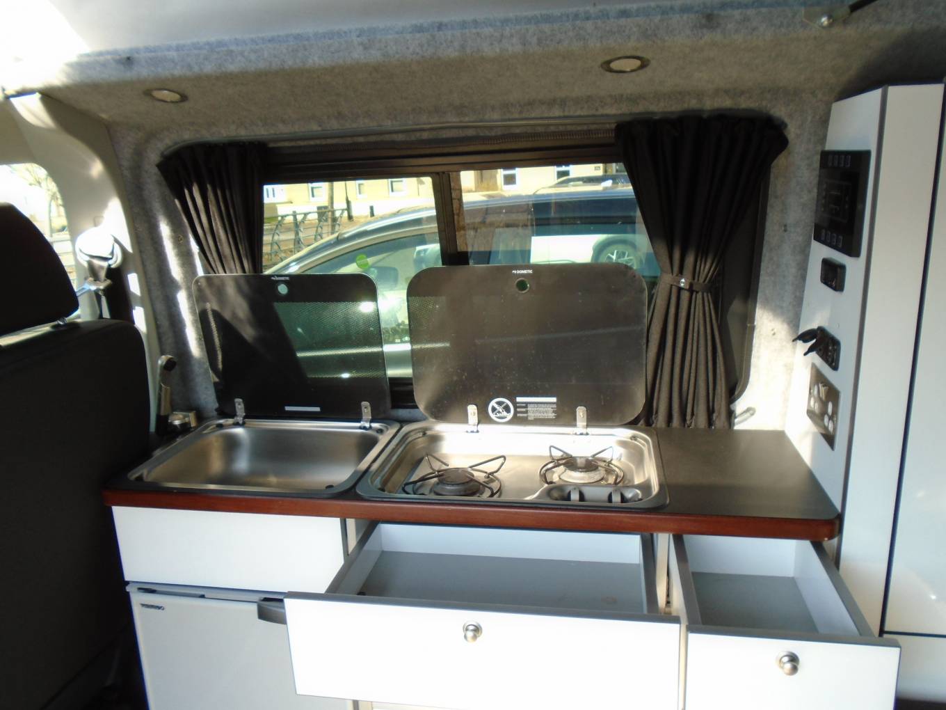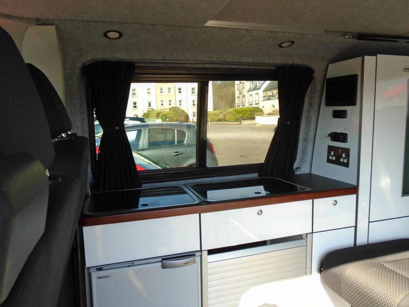 The living area is spacious with a stylish table for entertaining while the Vairotech seating system is easy to operate, slides into a queen size sleeping space with the added comfort of the quality of the finish. There are blackout curtains throughout with silver additional black out blinds for the cab and side windows. The Skyline pop top roof is easily opened and can create and additional sleeping space for two adults/children and can be adjusted to allow maximum head height inside the vehicle. Kitchen area is stylish with a good amount of cupboard space. There is a two ring gas hob with a sink and fresh water tap, with 12ltr fresh and waste water containers in situ under the sink area.
