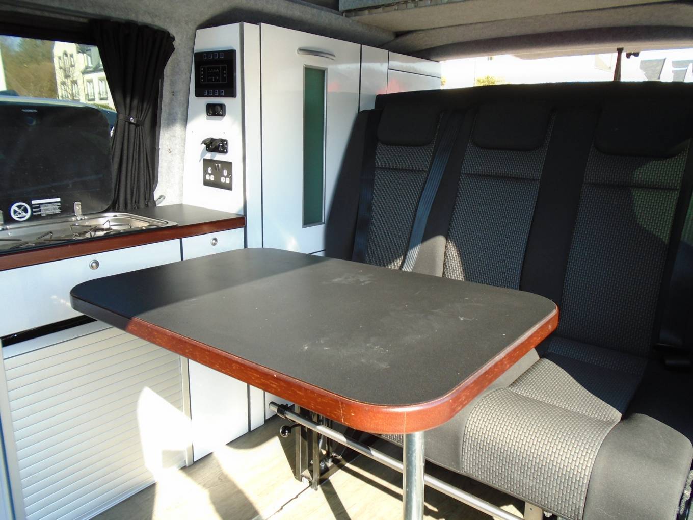 This VW has been converted to the sellers personal taste to maximise the use of space inside the vehicle in white and silver with a superb Rimmo 3000 Variotech Gliding Seat System. The pop top is easy to push up and is finished off to a high standard creating a cosy space for two adults to sleep comfortably. This vehicle would be ideal for a family travelling with small children as the vehicle comes with six seats and seat belts, which includes two Iso Fix points for children's car seats. It has an Auto Term Heating System which operates off the leisure and engine battery, 240 hook up, additional two kitchen sockets and four USB points throughout.
