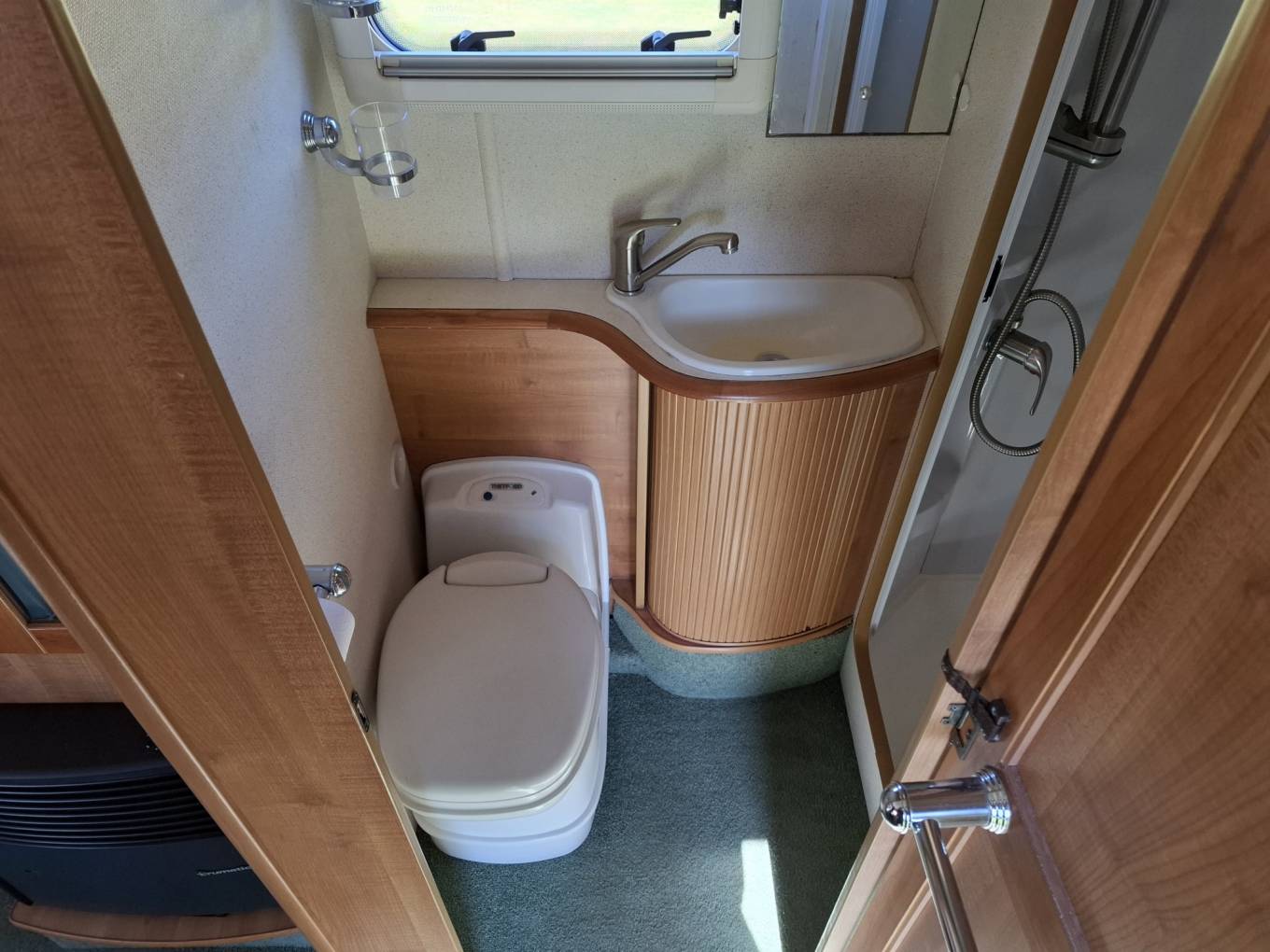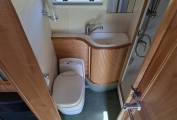 At the offside rear of the vehicle, opposite the habitation door and adjacent to the kitchen, is the bathroom, with a toilet, a hand basin, and a screened shower cubicle.