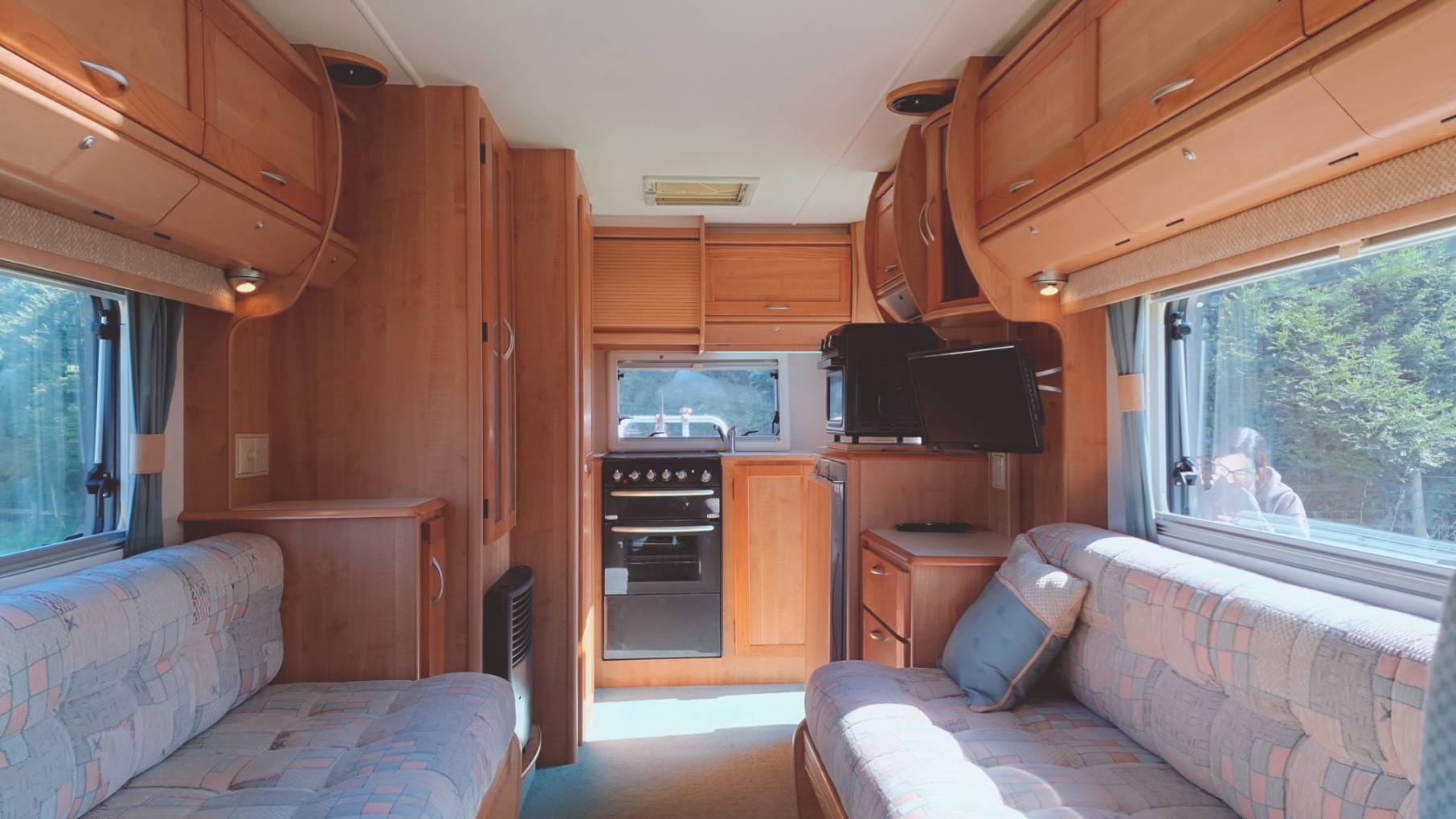 Behind the cab are opposing side sofas for dining and leisure, and which can be used as two single beds (185cm (L) x 70cm (W)) or converted into a large transverse double berth bed (208cm (L) x 185cm (W)).
