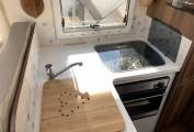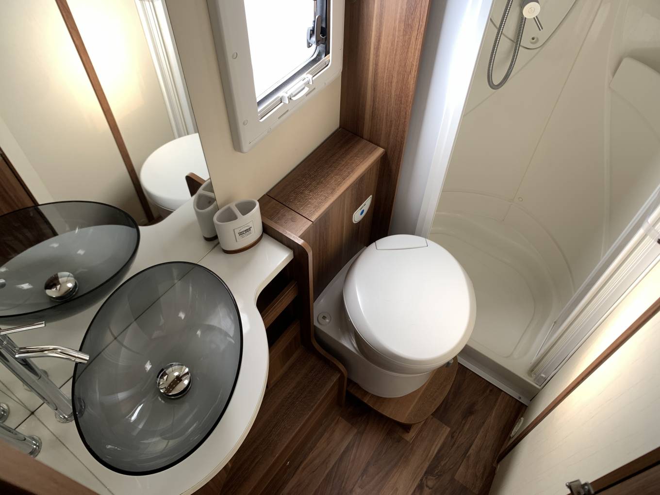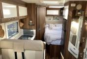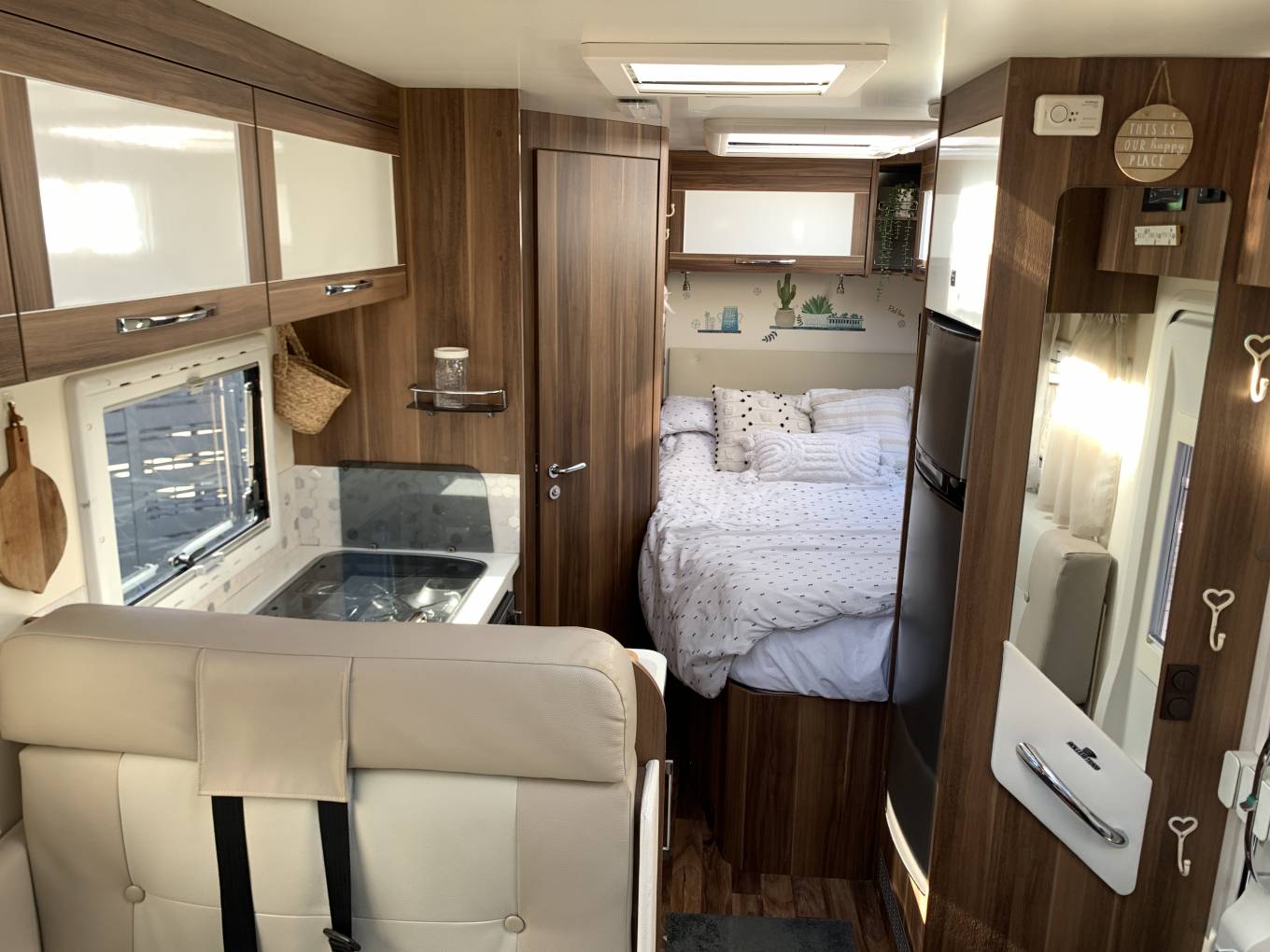 A Rollerteam 694 with rear French bed, adjacent washroom, fully equipped mid kitchen and a lounge with two extra belted travelling seats, both cab seats rotate providing extra dining and lounging space.