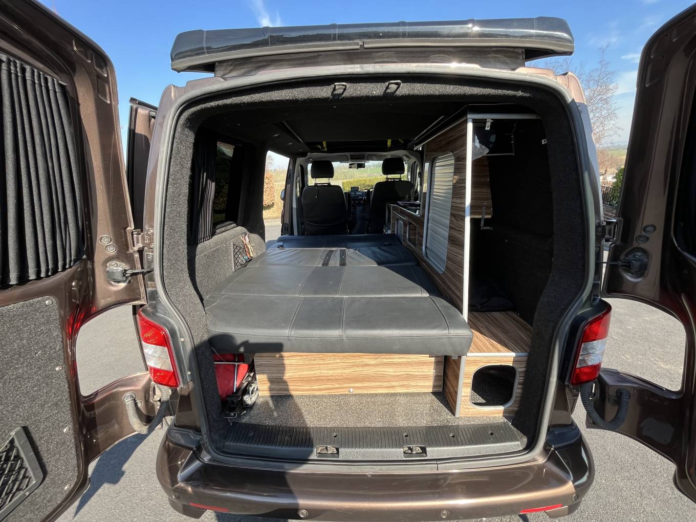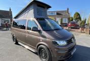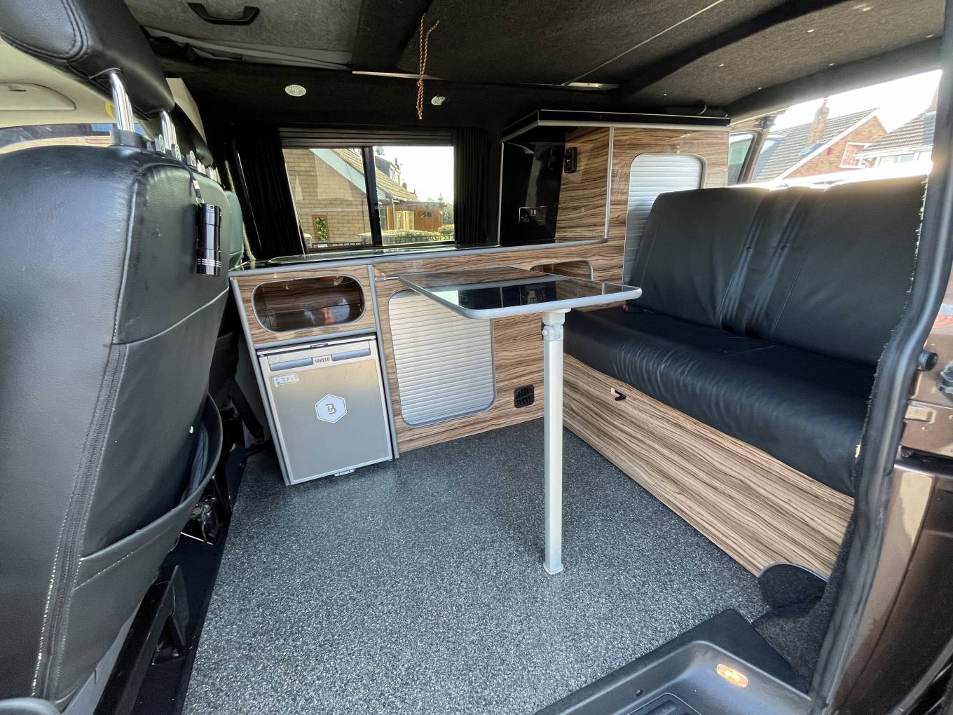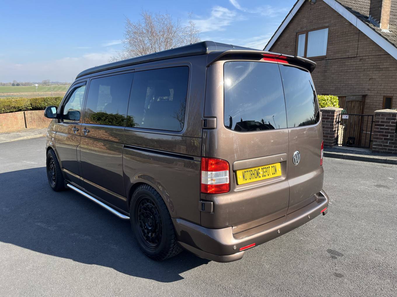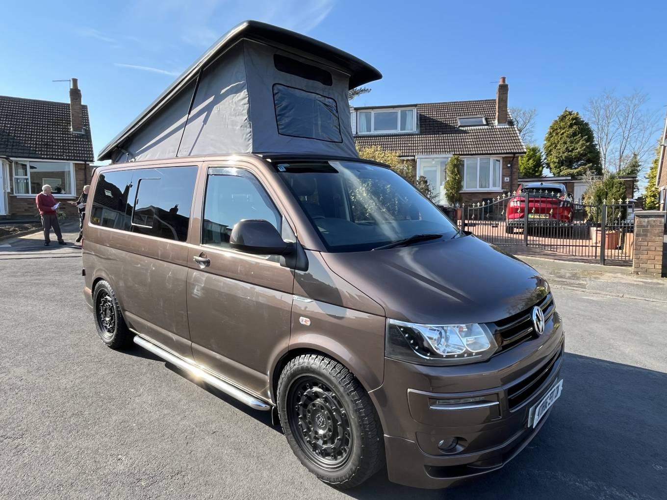 Volkswagen T5 Campervan with Pop Top. This van was professionally converted in 2018, the base vehicle is a T30 DSG Auto, it has been well maintained with last service Oct 2024 and Cam Belt and Water Pump Jan 2023. This is a lovely looking van, finished in brown metalic and 18 inch Black Rhino Alloys with General Grabber Tyres. Inside the van at the rear is the rock and roll bed with good storage underneath, the kitchen has a 2 burner hob, sink and fridge and with the roof elevated there is plenty of head room. All the seats are finished in leather and the front passenger seat swivles. It comes with Cab Air Con, Cruise Control, 4 Seat Belts, Front and Rear Sensors, CD Radio, Sat Nav, Blown Air Heating, Gas Bottle, Mains Lead and 2 sets of keys. A stunning campervan available for viewing by appointment in Kirkham, call for more photos, videos and information.