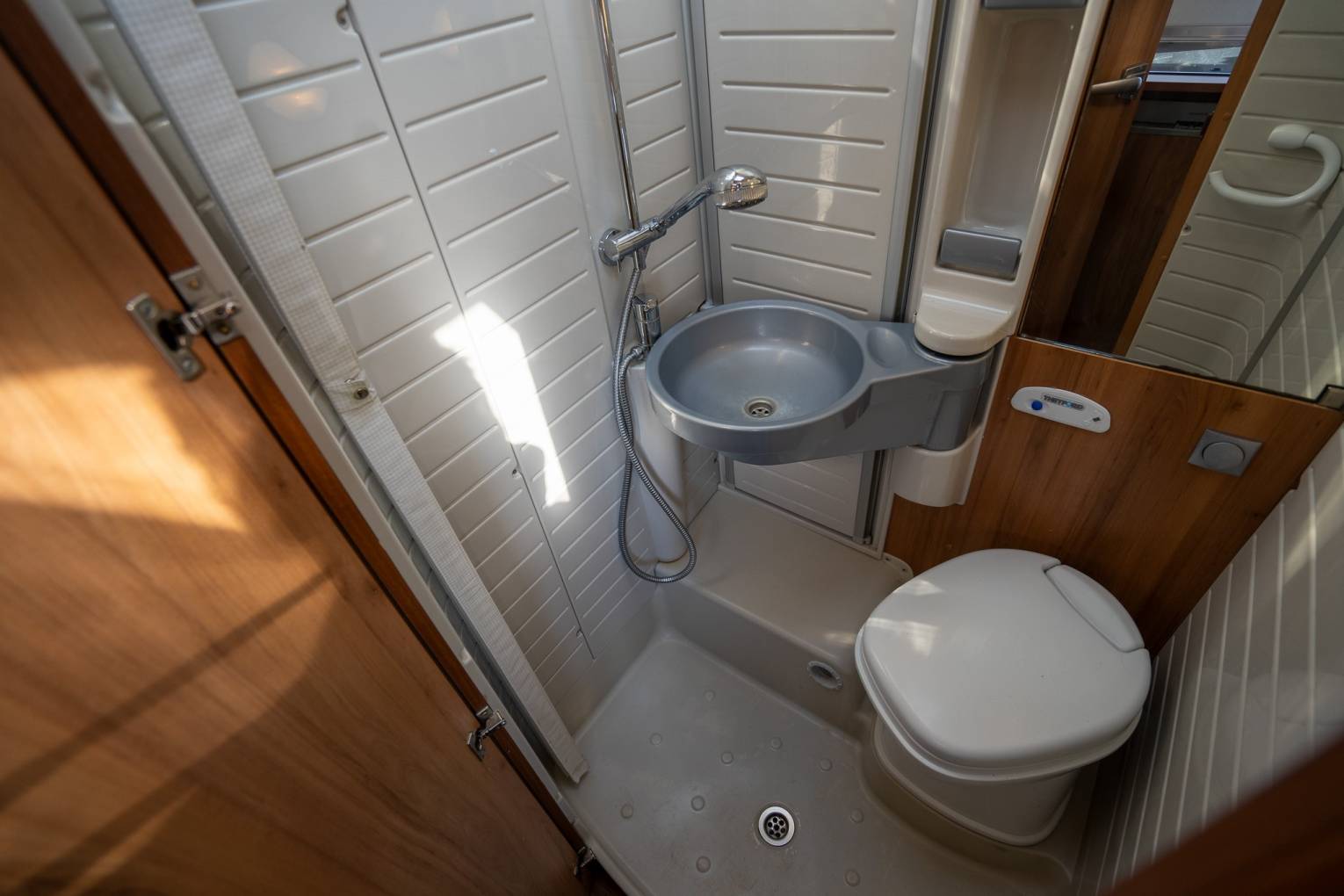 tap. Opposite is an attractive washroom comprising sink, Thetford toilet and a