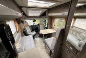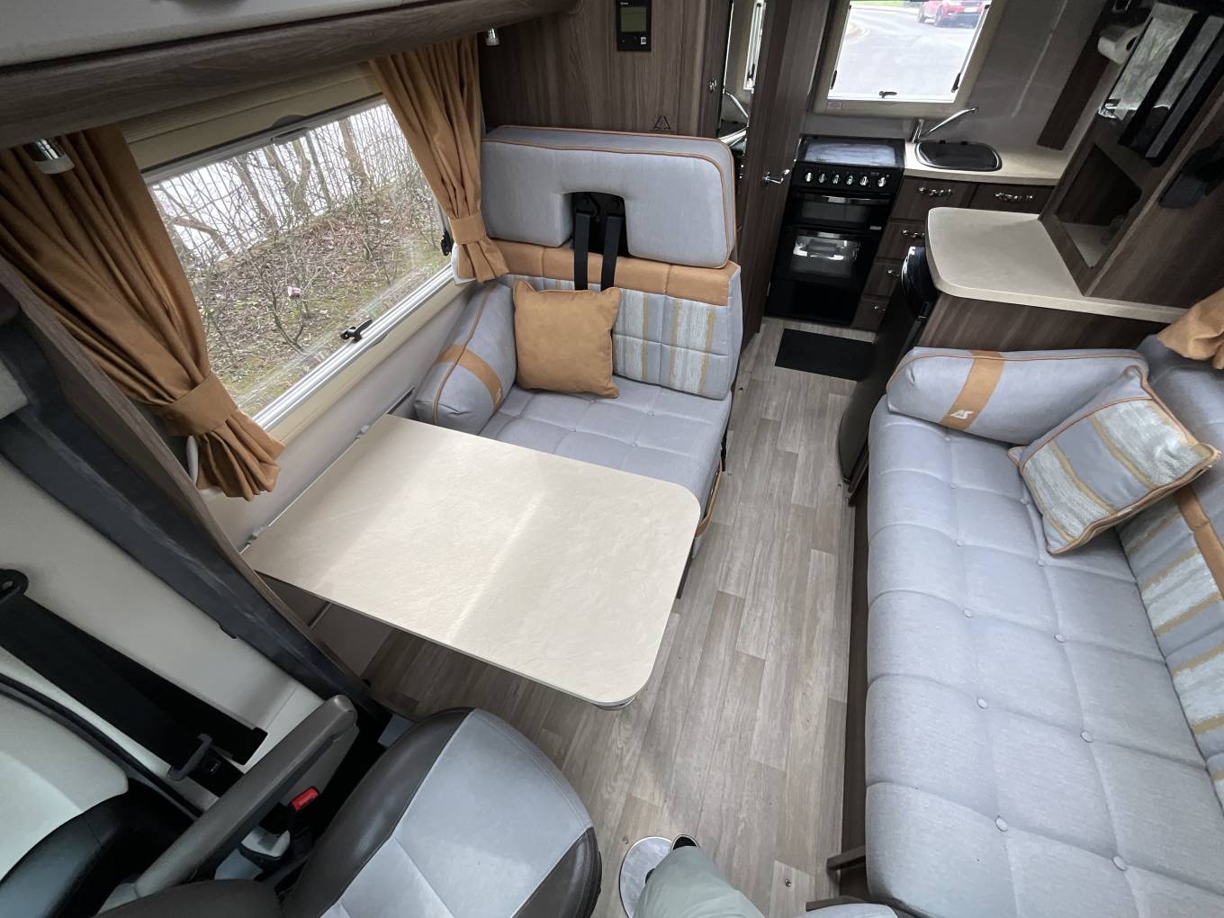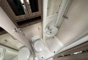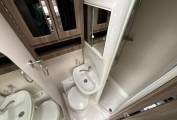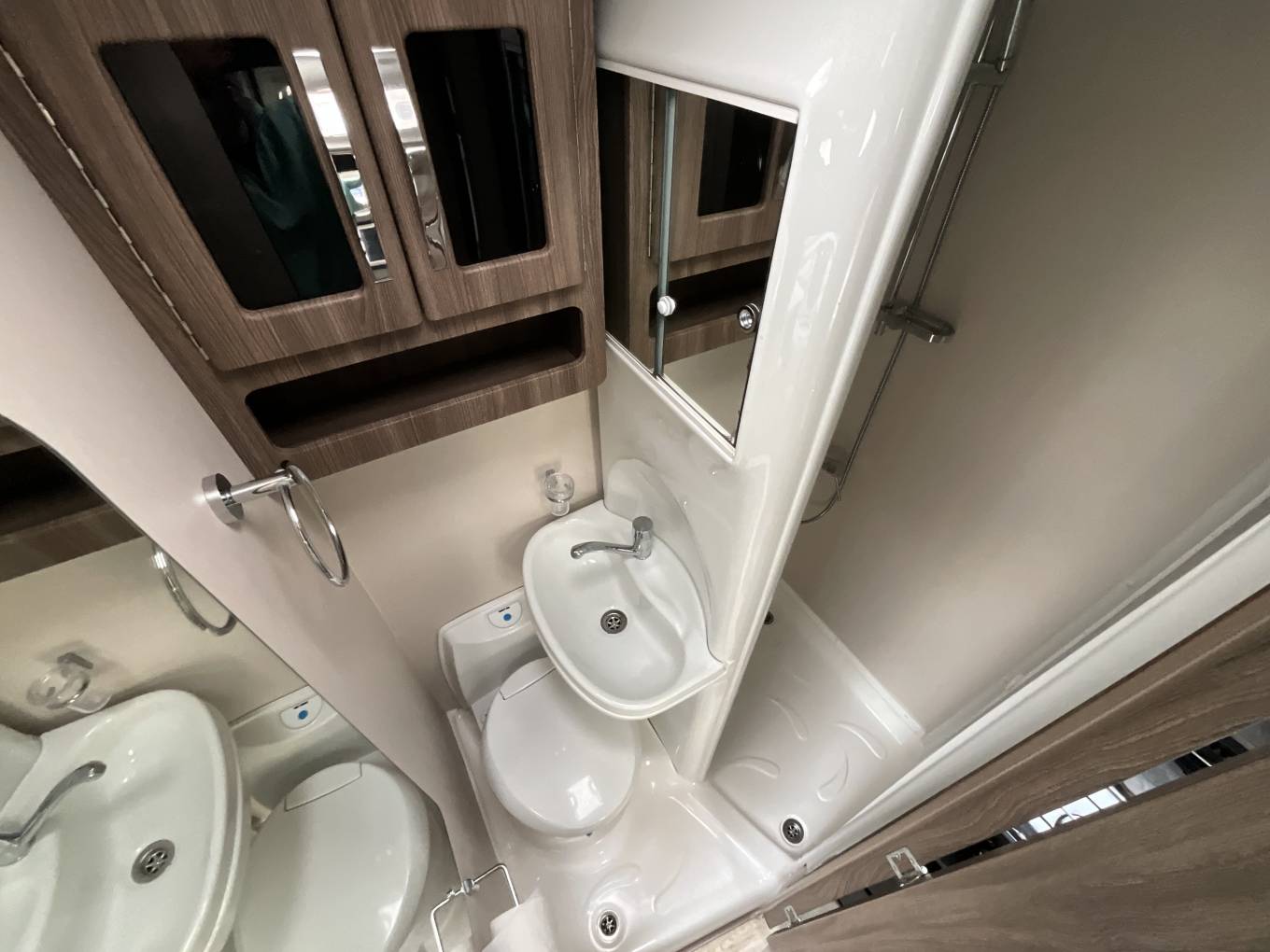 Starting at the heart of the motorhome is the generous front lounge with more than enough room to relax or entertain. This space is well lit, thanks to a big sunroof over the cab, a large Heki and two sizeable side windows. With a long sofa, half dinette and 2 captain swivel seats this area provides amble seating for up to 6 people and then easily coverts into a comfortable double bed when you’re ready to rest.. The end kitchen is fully equipped with a four-burner dual-fuel hob above a separate oven and grill, sink with mixer tap, fridge which is complete with ice box, storage cupboards and an eye level microwave. Adjacent to this is the practical washroom which includes a cassette toilet and manages to include a shower cubicle thanks to a clever floating partition wall which also houses the wash basin with mixer tap and mirror. Storage in the Nuevo is great with an external access locker under one of the benches and a lower locker in the skirt, internally there are plenty of cupboards and also a hanging wardrobe.