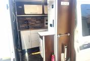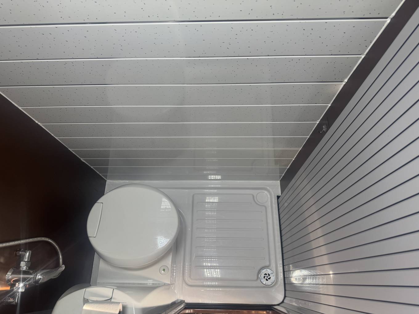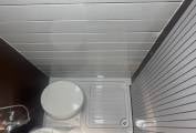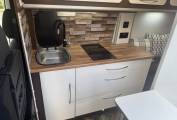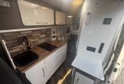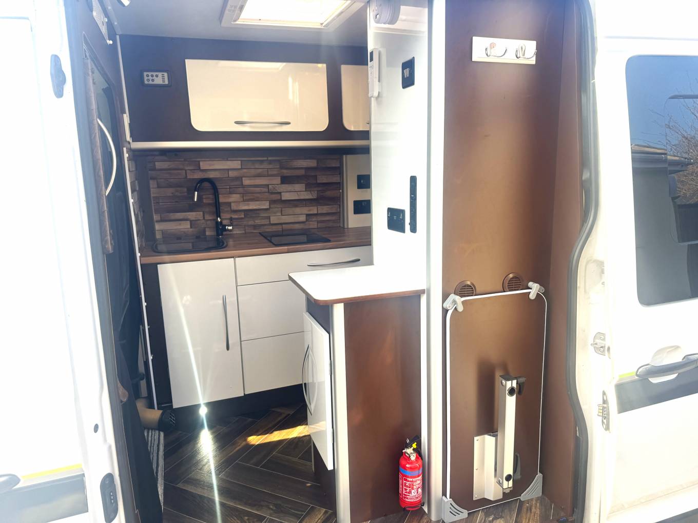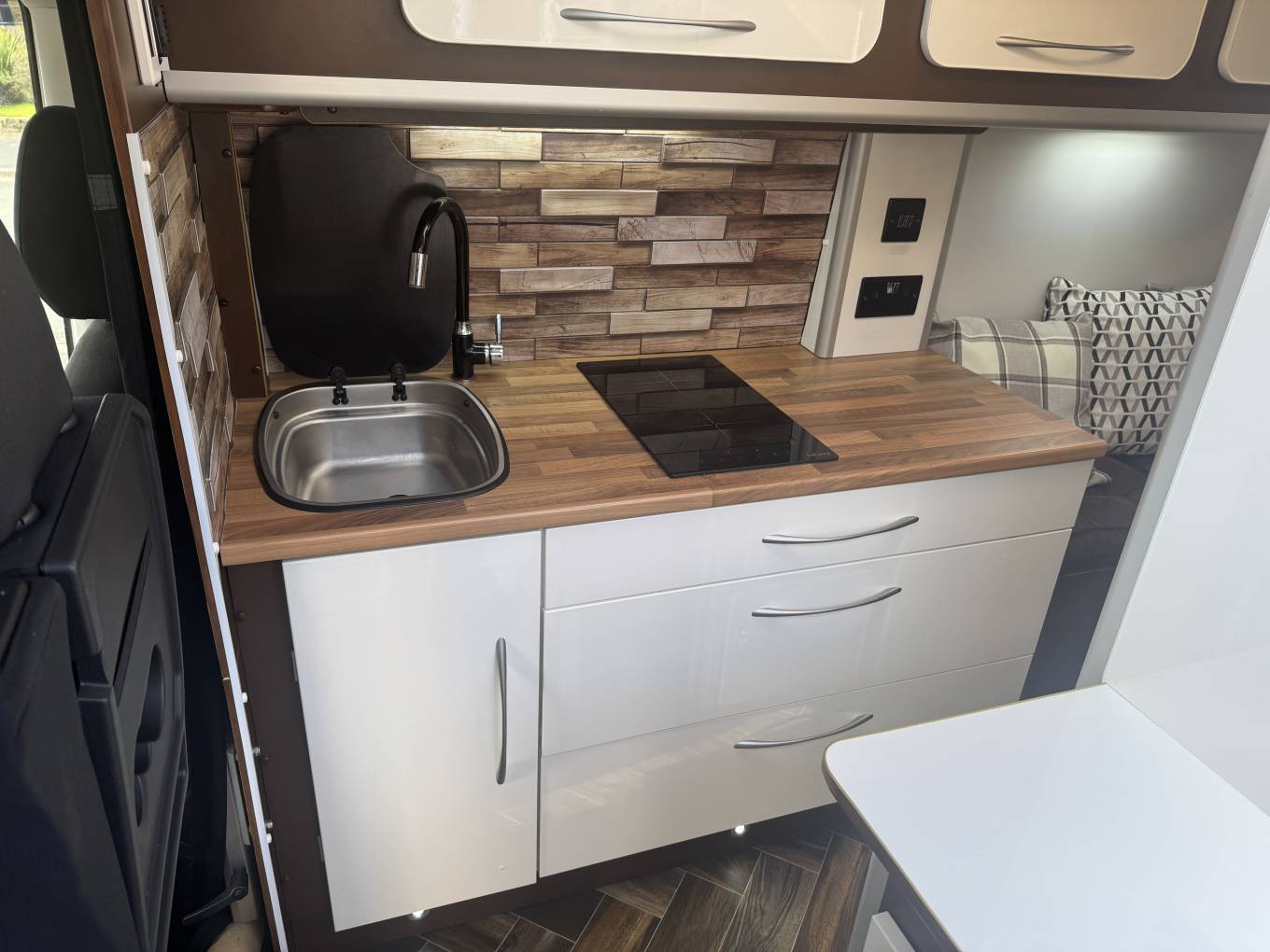 Moving through the motorhome we have a full length separate shower with instant hot water supplied from heating interface and built in water tanks. Opposite this area we have the kitchen unit which includes a wash basin with mixer tap, electric 2 way hob, microwave and Alpicool fridge/ freezer.