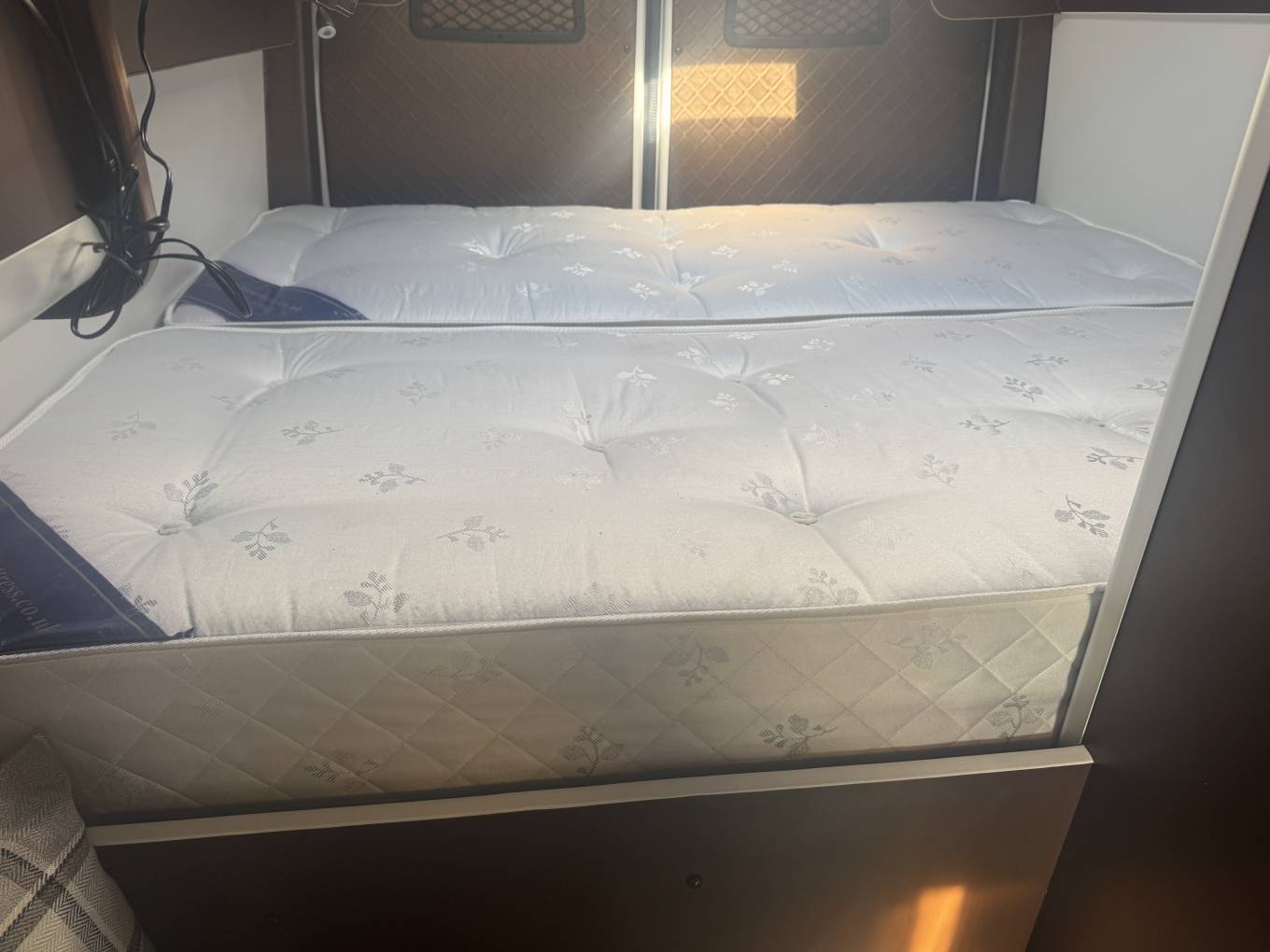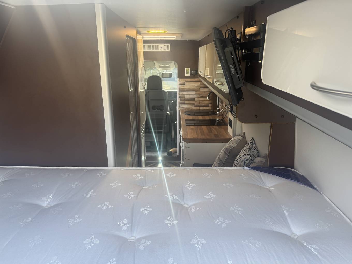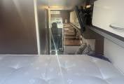 Starting at the rear of the camper, there is the elevated large fixed double bed along with multiple lights and a roof skylight with blinds. There are also wardrobes and storage shelves adjacent to the bed. Beneath the bed is the garage which has bags of storage space for items such as luggage, drive away awnings, paddle boards and kayaks etc and can be easily accessed from inside the camper by opening the low level door.