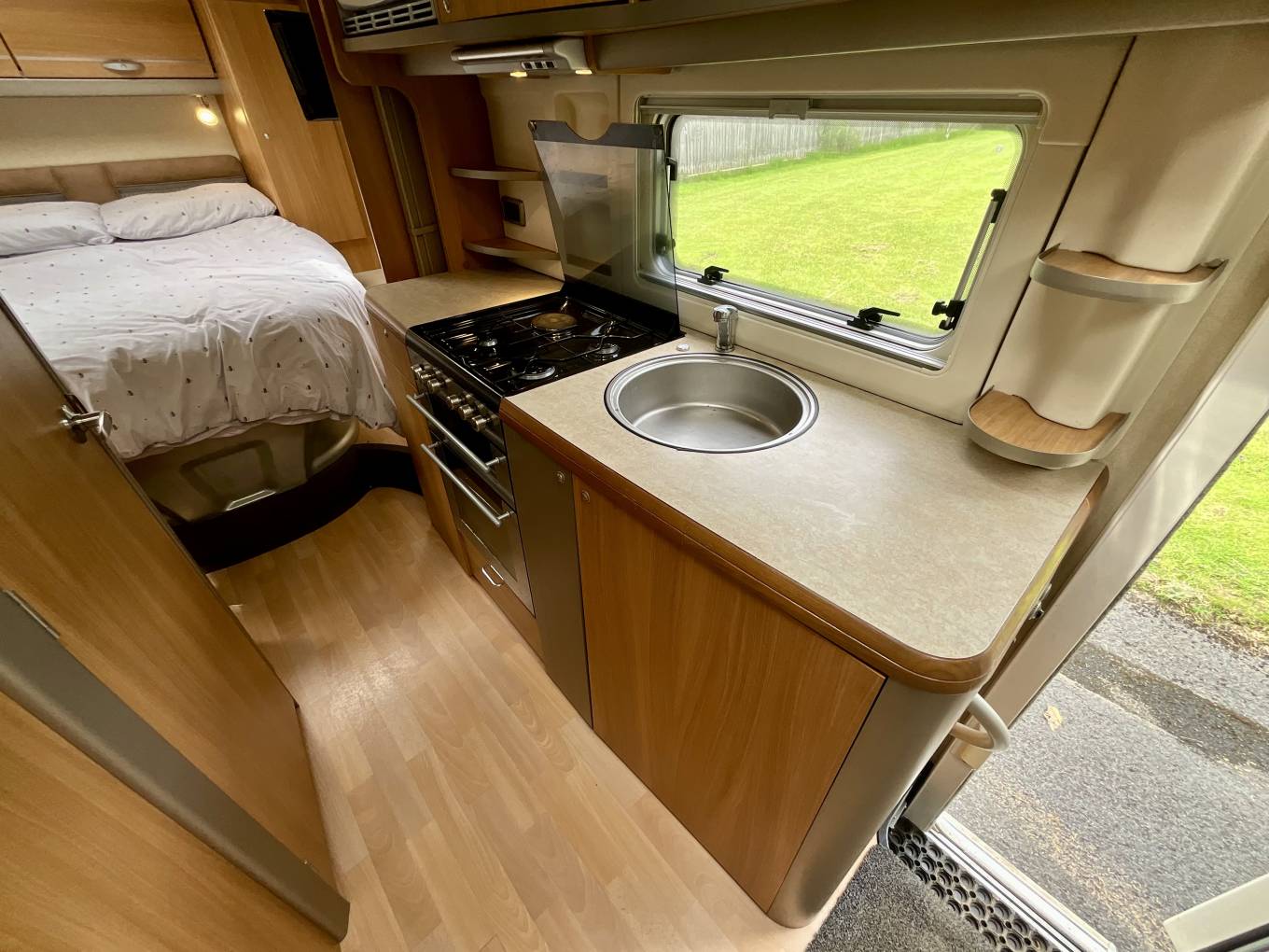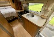 A kitchen in the middle of the 669 comes fully equipped with everything the travelling chef needs, including oven with grill, gas hobs, three way fridge/freezer, microwave and sink.