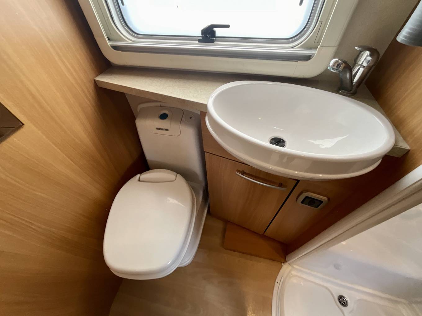 The washroom opposite is complete with shower cubicle with screens, washbasin, large vanity unit and Thetford toilet with cassette.