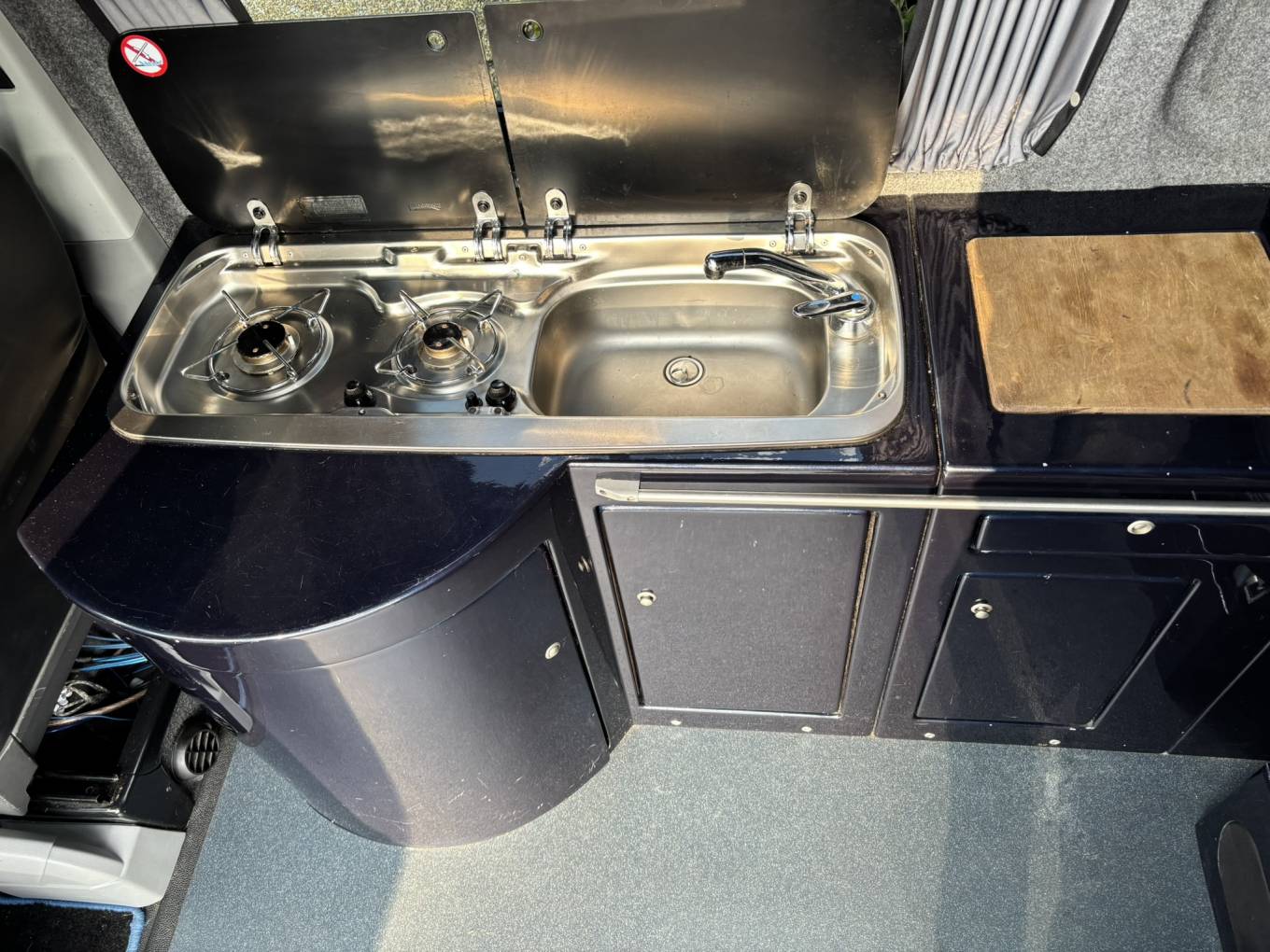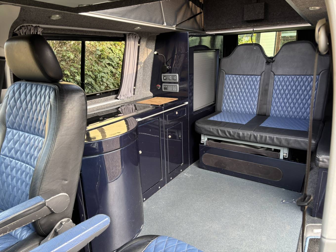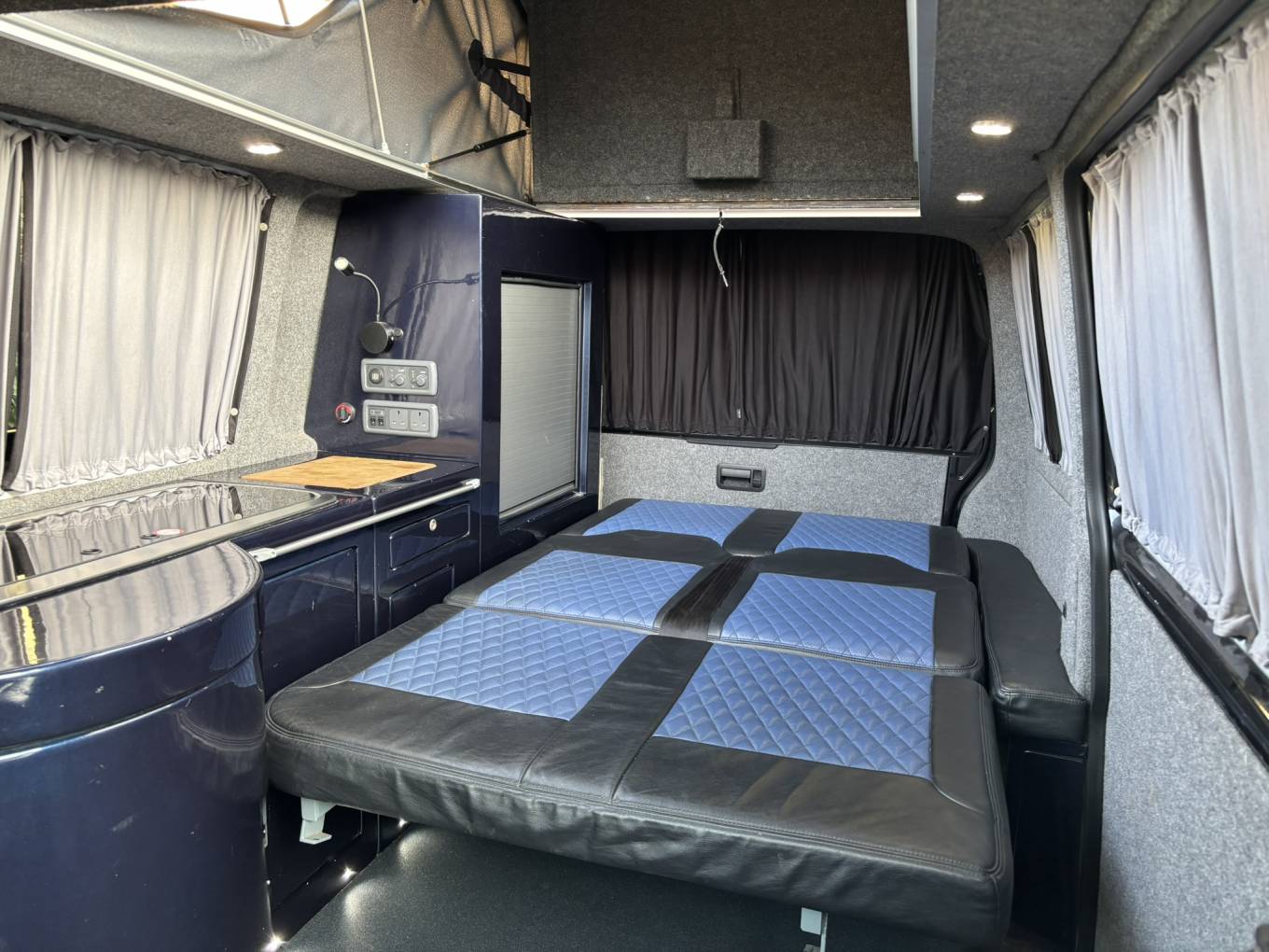 This Camper has some premium features that show this conversion wasn't done on a budget. Notably the vehicle is a 140BHP 6 speed engine which really helps when driving with load, has reversing camera, captain front seats for passenger and driver, Tailgate heated with wash wipe, Air con as well as having the very low profile HiLo roof which is well known for being a stealth pop top - when the roof is down you wouldn't even know it's a camper van from the outside.