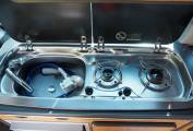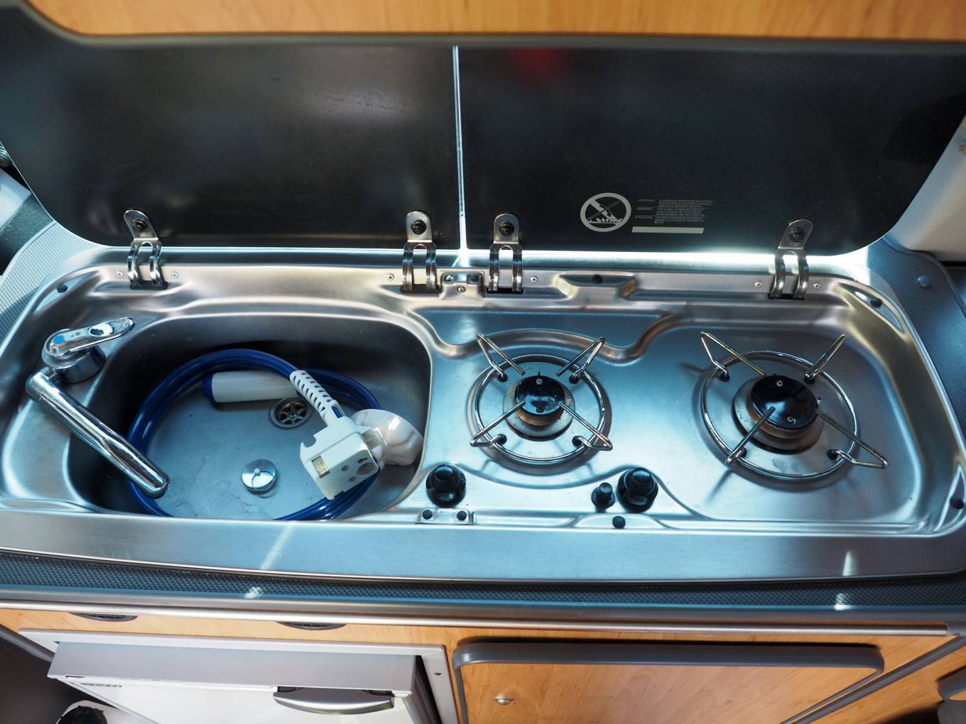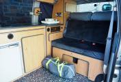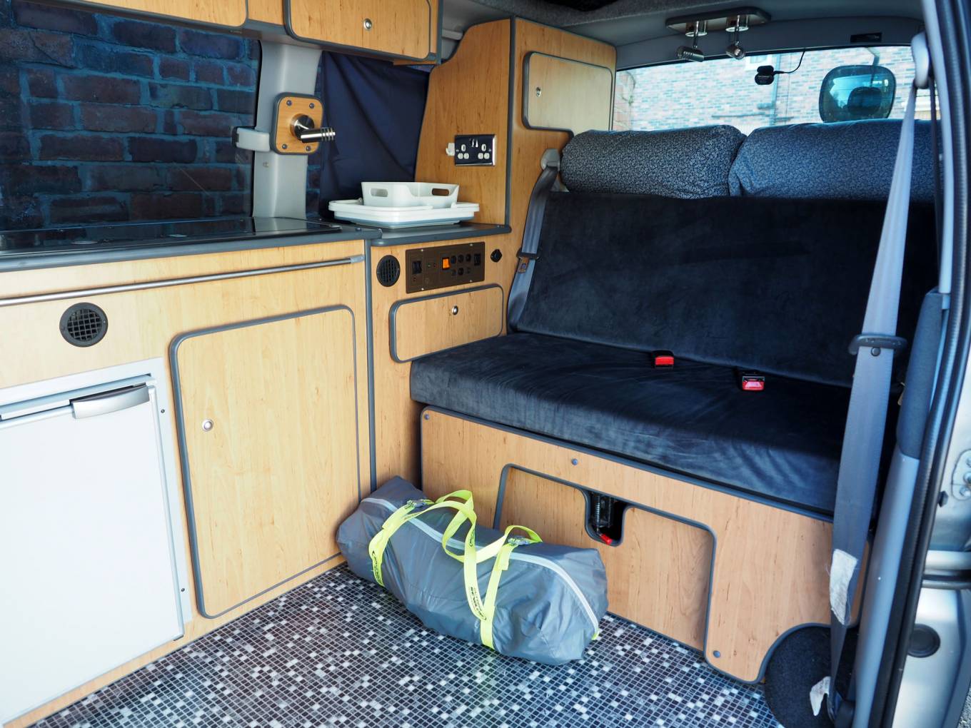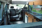 The upper roof bed is large enough for two children or one adult, and the lower bed up to two adults. There is a good range of storage lockers, a hook on table top and swivel passenger seat. In the habitation area there is 12v lighting, mains control unit with integrated battery charger. All the fixtures and fittings are of good, durable quality.