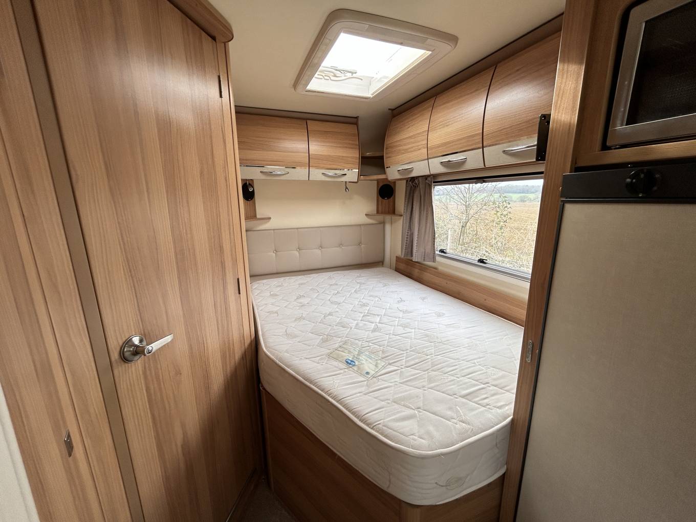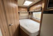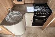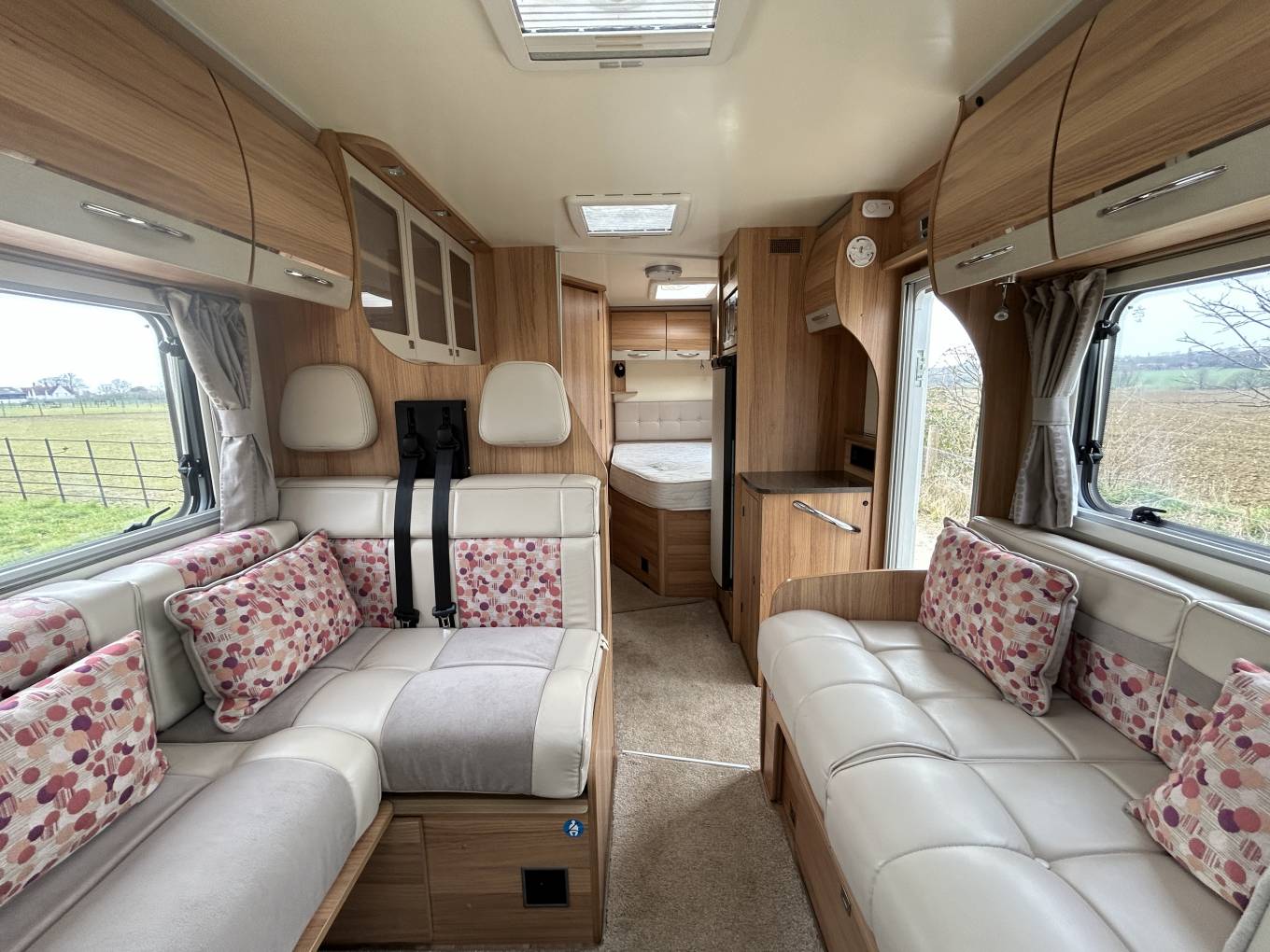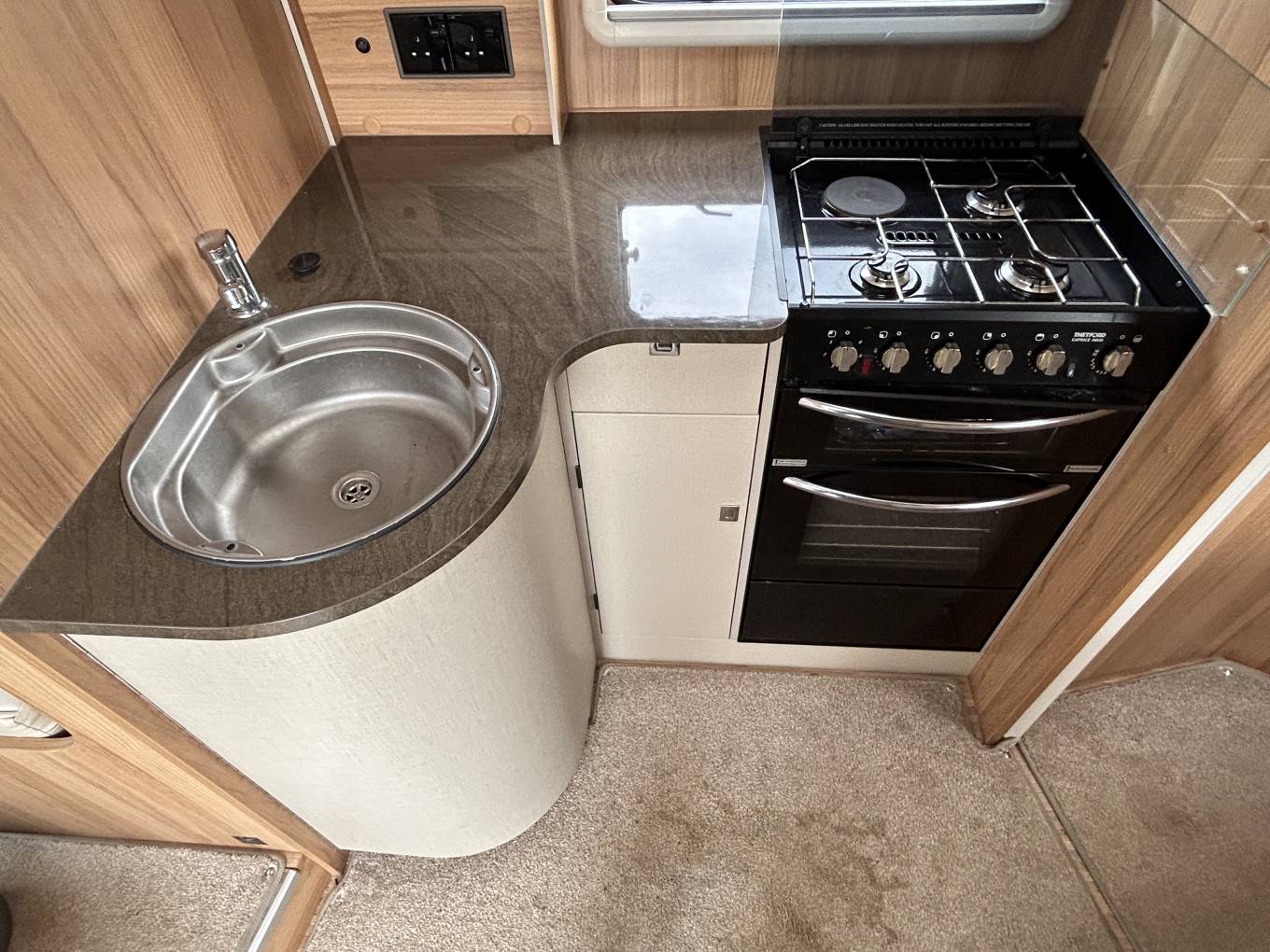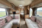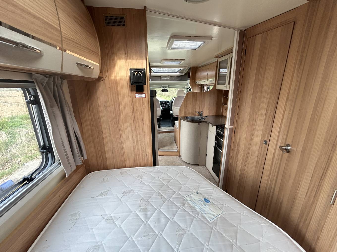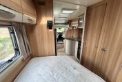 The internal layout of this Bailey is superb and once again presented in excellent condition. At the front you have an extremely spacious front lounge/dining area that is bright and clean. This is made up of the two captains chairs, a side facing sofa and a further L-shaped sofa comfortably seating 6 people. There is a separate table that can also be set up in the lounge, creating the perfect place for a meal or snack. Above the lounge is a large sunroof and further skylight which lets the natural light flood in. Moving back you come to an extremely well equipped kitchen area. This includes an oven, grill, duel fuel hob with gas burners and an electric hotplate, microwave, sink and large fridge with separate freezer.