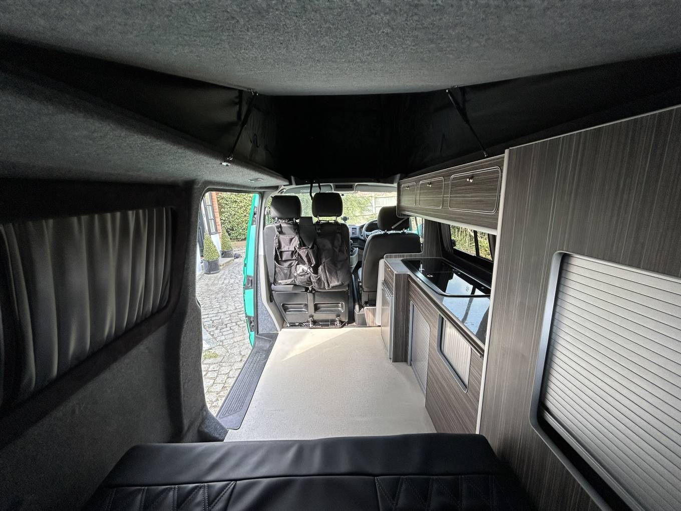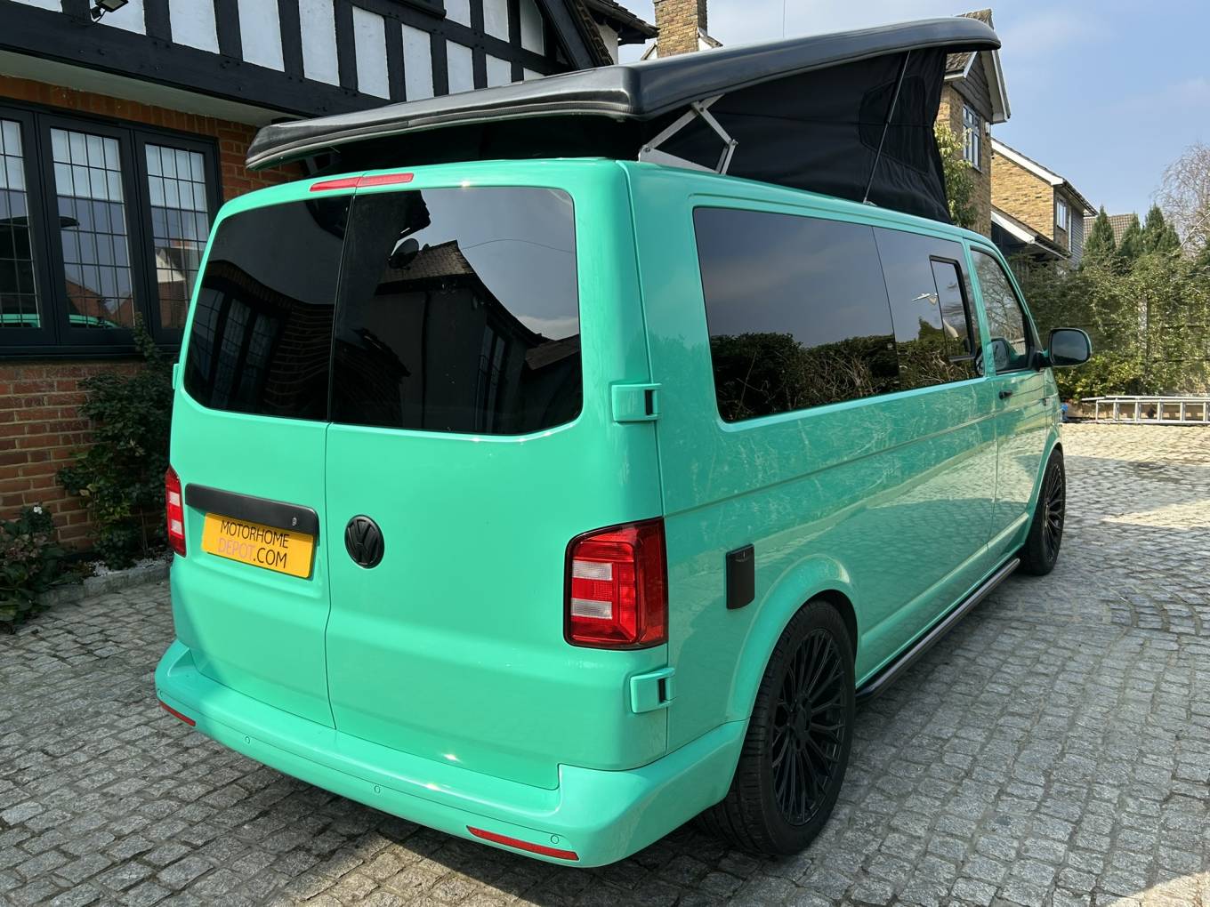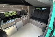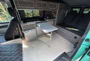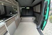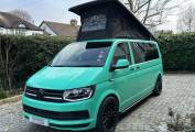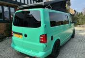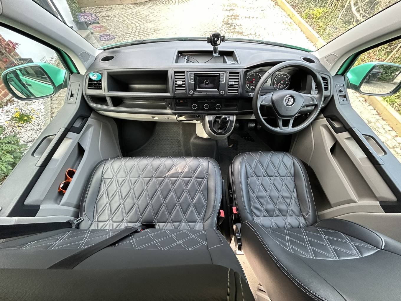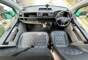 This gorgeous 2019 Volkswagen Transporter T28 campervan is a masterclass in compact luxury, professionally converted by Big Wave Campers to combine practicality with modern comfort. With its 4-berth, 4-seatbelt layout, this campervan is perfect for families or groups seeking weekend escapes or extended road trips. The sleek design, upgraded LED front lights, lowered frame and black side skirts along with its crisp green exterior ensure it turns heads wherever it roams.