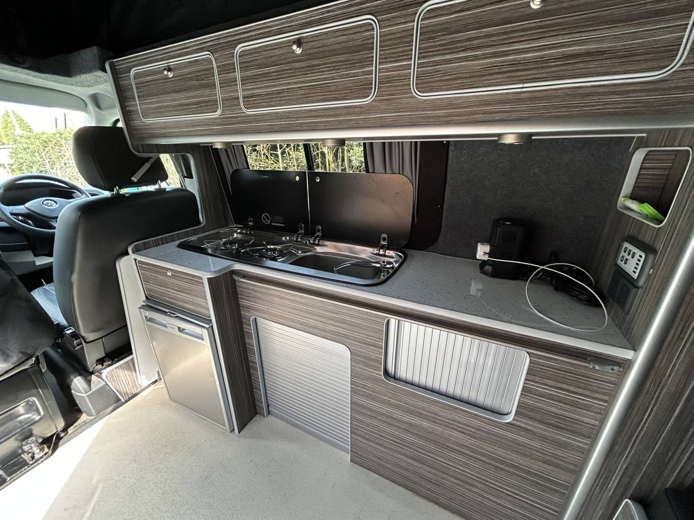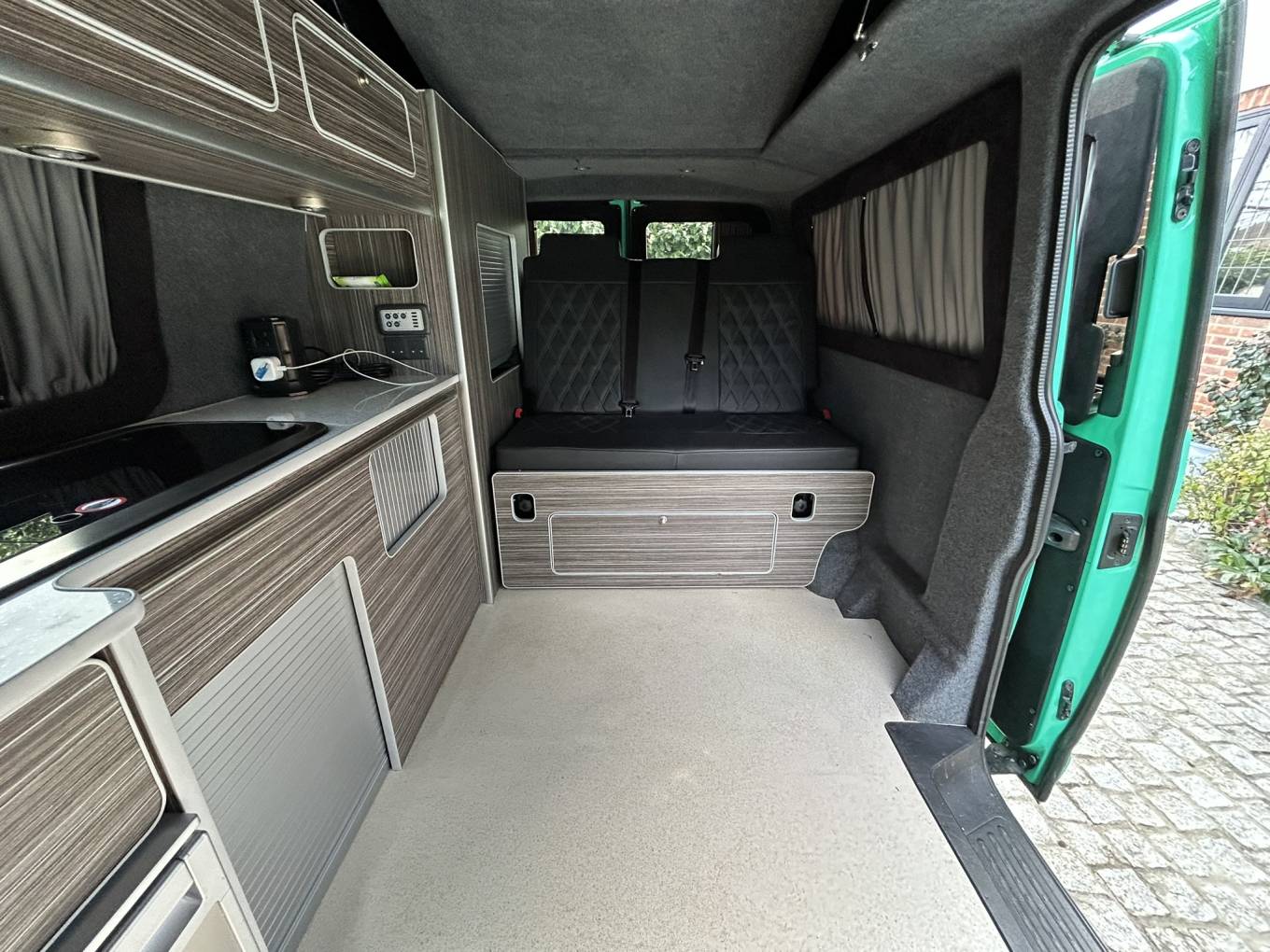 Inside this vehicle is well equipped with a comfortable Rock N Roll double bed with a bespoke leather finish. The pop-top roof adds a second double sleeping area for extended living space. The front of the cabin also features a double front seat to create extra space in the lounge or dining area with a removable table in the centre. There is plenty of lighting along with blackout blinds to ensure comfort for both day and night.