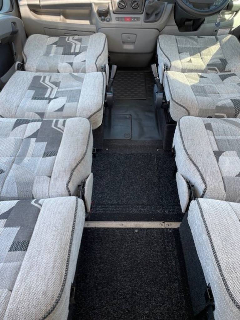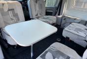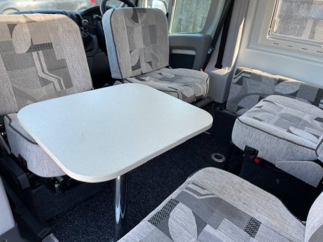 The front 2 swivelling seats and the 2 belted seats convert into 2 single beds or a double bed. The dining table can be stowed away while travelling.