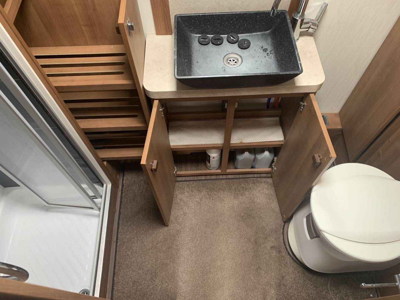 with toilet, sink and shower with full enclosure. There is plenty of storage in