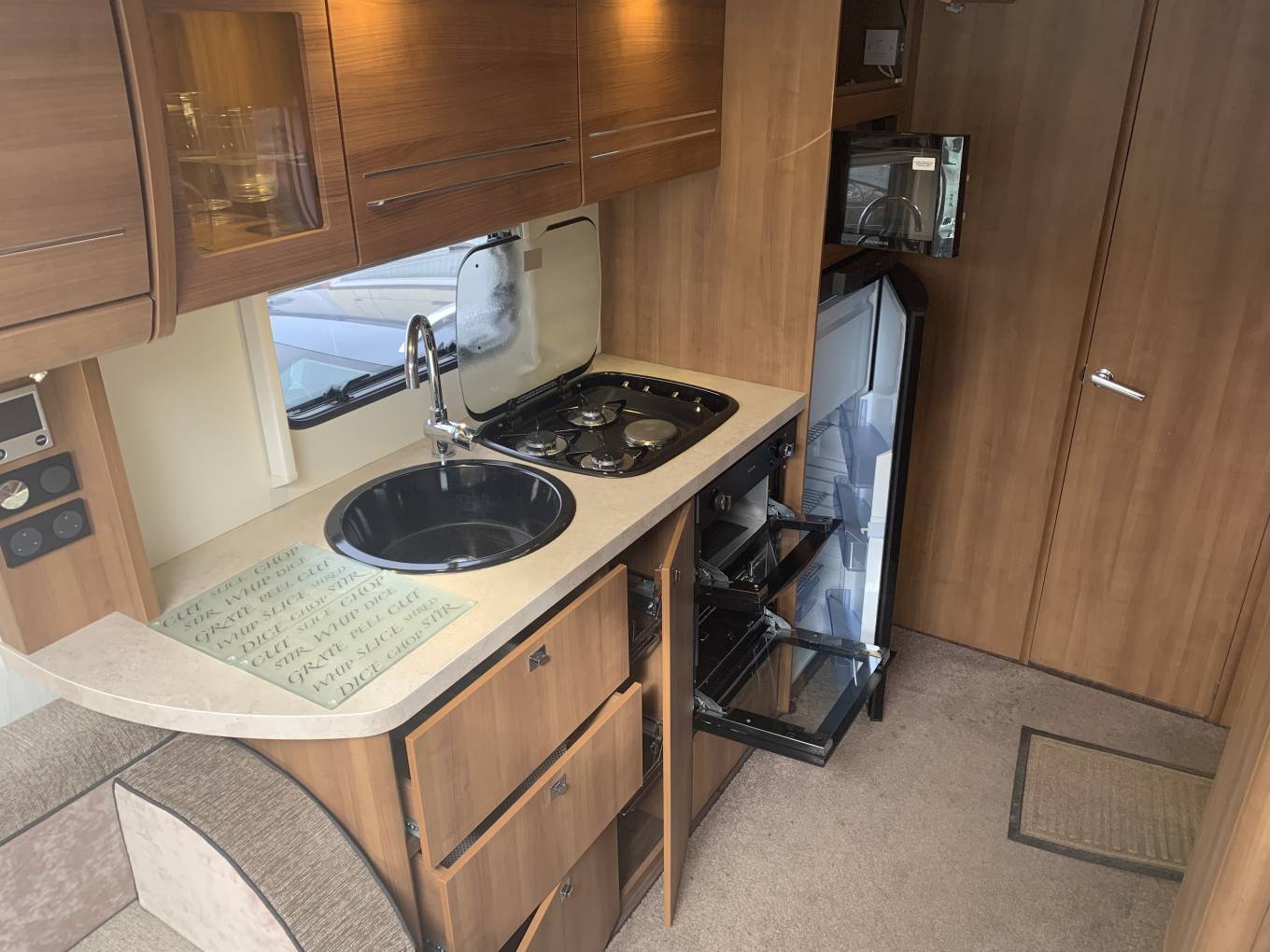 a touring holiday, incl tall fridge freezer, sink, microwave, extractor and cooker