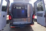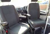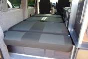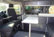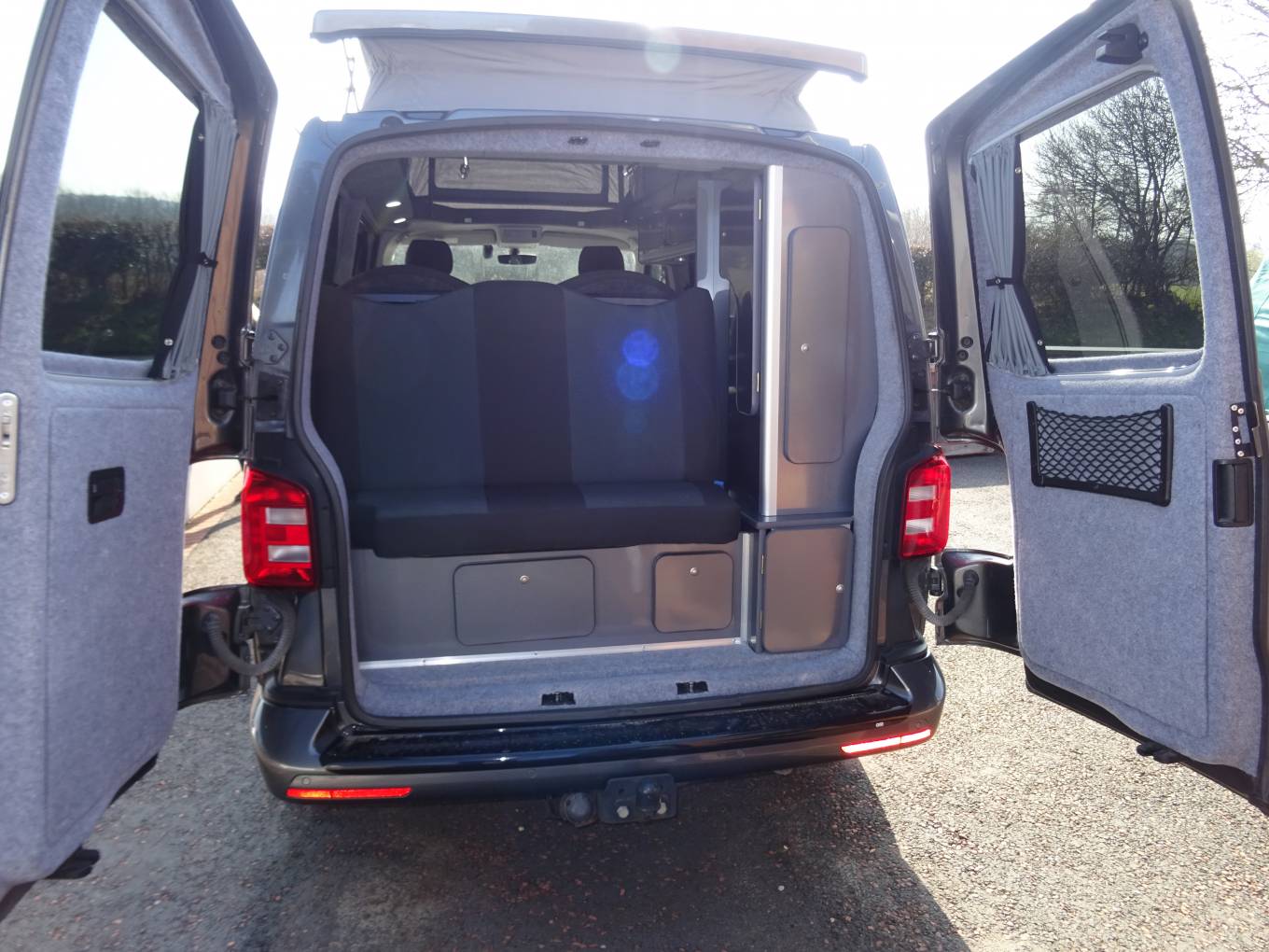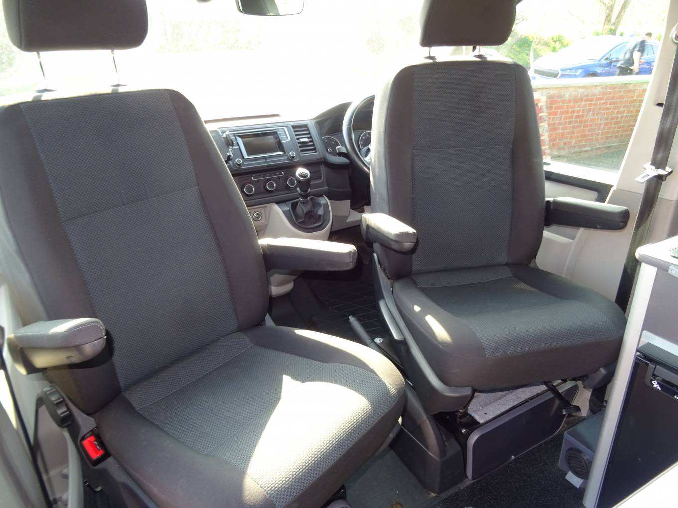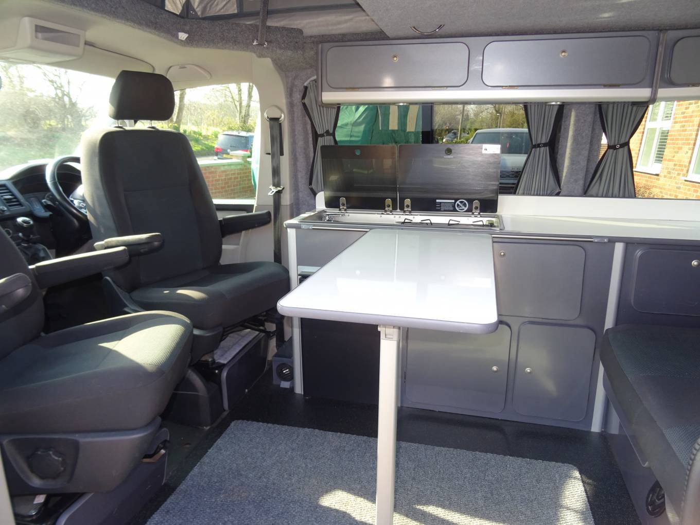 On entering the side door you have a stunning kitchen area with separate sink, 2 gas rings, fridge, worktop and lots of storage space. Two single front seats fully adjustable with armrest and they both swivel round making the seating area very comfortable and a great socialising space or dining area. To the back the rear seat has 2 seat belts and easily makes into a good size double bed. The pop top bed will comfortably sleep 2 people.