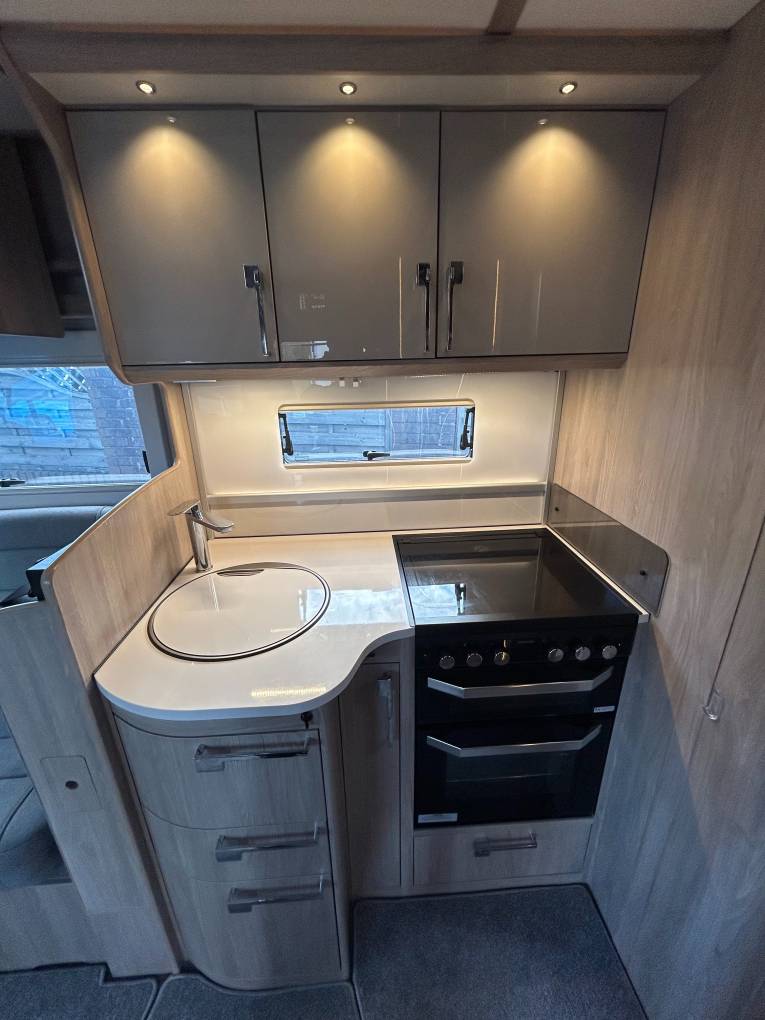 When it’s time to unwind, freshen up in the separate shower cubicle or relax in the private washroom featuring a cassette toilet, vanity unit, and a modern sink with a mixer tap.