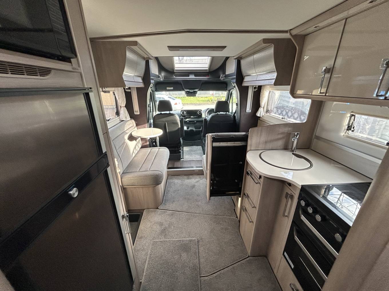 Inside, the sophisticated living space is designed to bring people together. Swivel the captain seats to face the central dining area, where modern elegance meets functional design. Relax, dine, or enjoy movie nights with a sleek wall-mounted TV. With flexible seating that transforms into two forward-facing, belted seats, the TM 545 offers safe and comfortable travel for a family of four. Sleeping arrangements are effortlessly catered for with a luxurious electric drop-down bed and a spacious rear island double bed, with a second TV, ensuring a restful night for all.