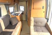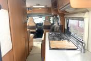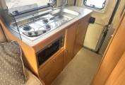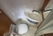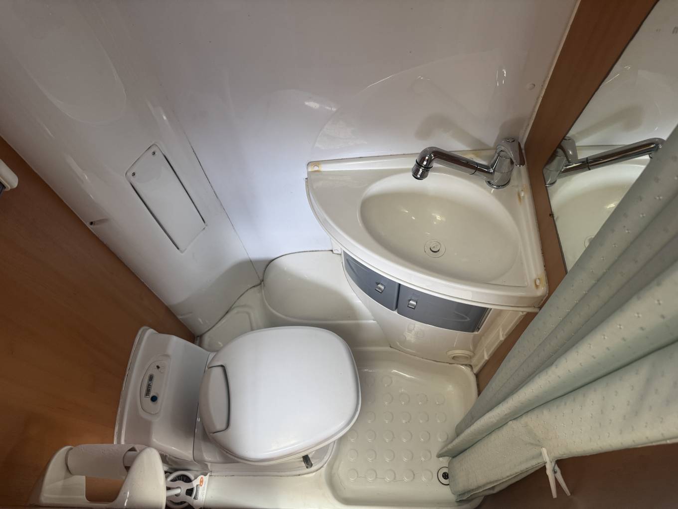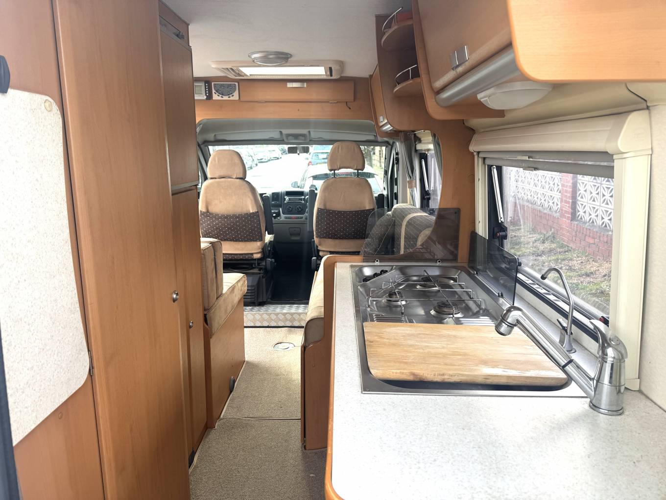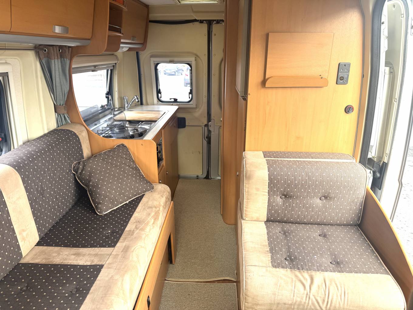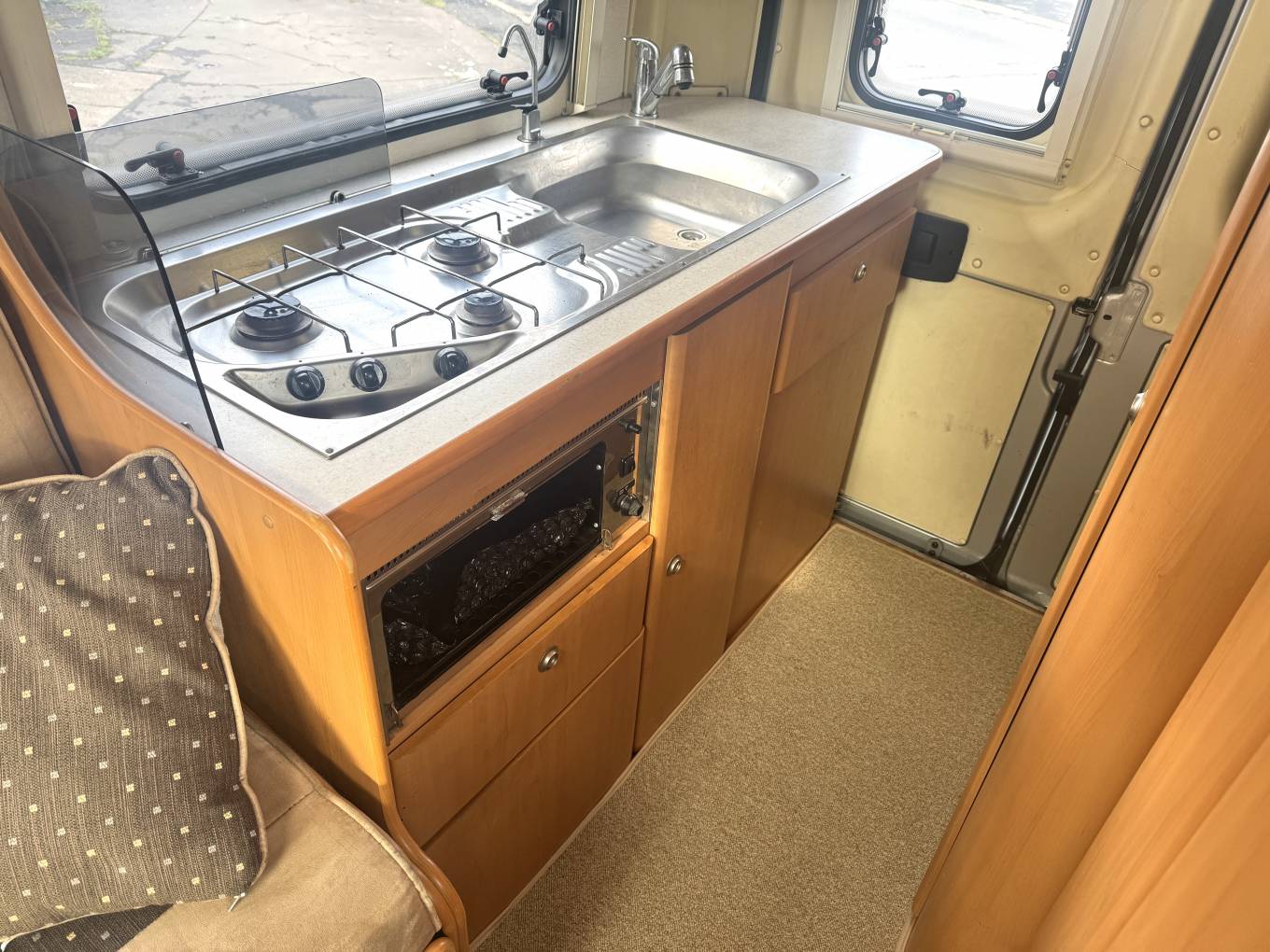 The layout of this motorhome is rear kitchen and washroom. Starting with the kitchen where there is a 3 ring gas hob with grille, sink with storage overhead and underneath and a Dometic fridge with freezer compartment. Also at the rear adjacent to the kitchen is the washroom which includes a Thetford cassette toilet, sink with hot and cold taps and separate shower head.